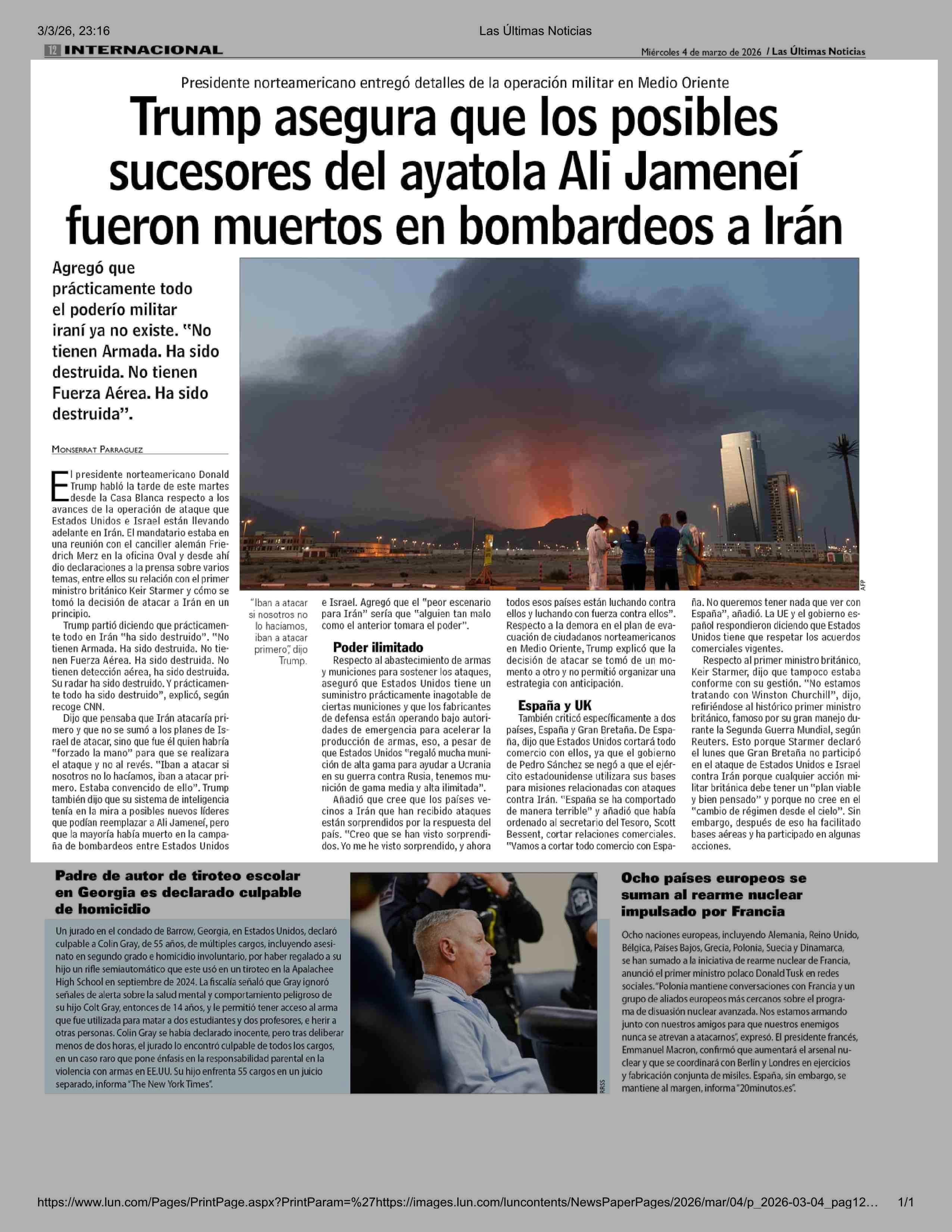 Trump asegura que los posibles sucesores del ayatola Ali Jameneí fueron muertos en bombardeos a Irán 04-03-2026 Las Últimas Noticias |