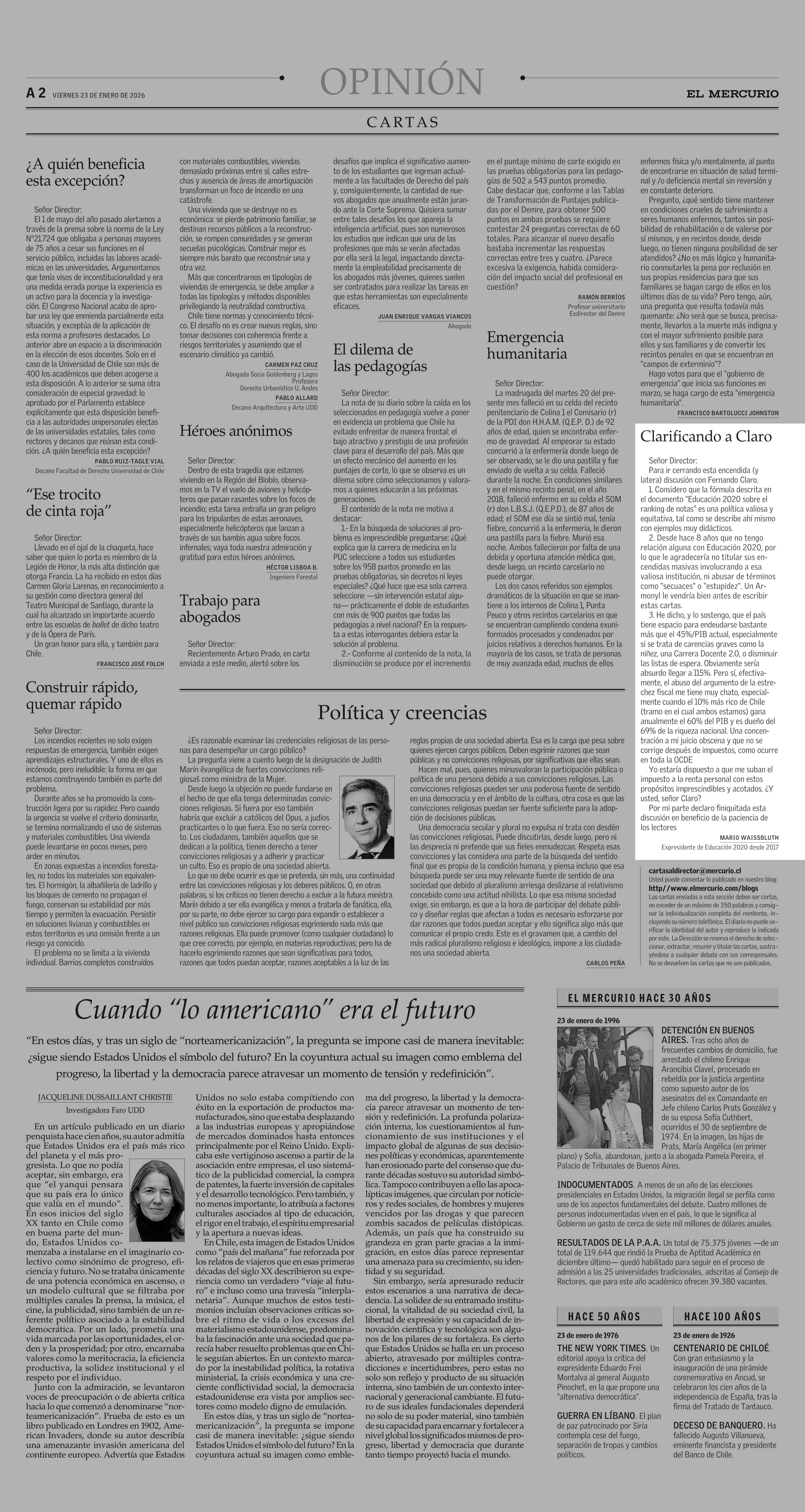 CARTAS: Clarificando a Claro 23-01-2026 El Mercurio |