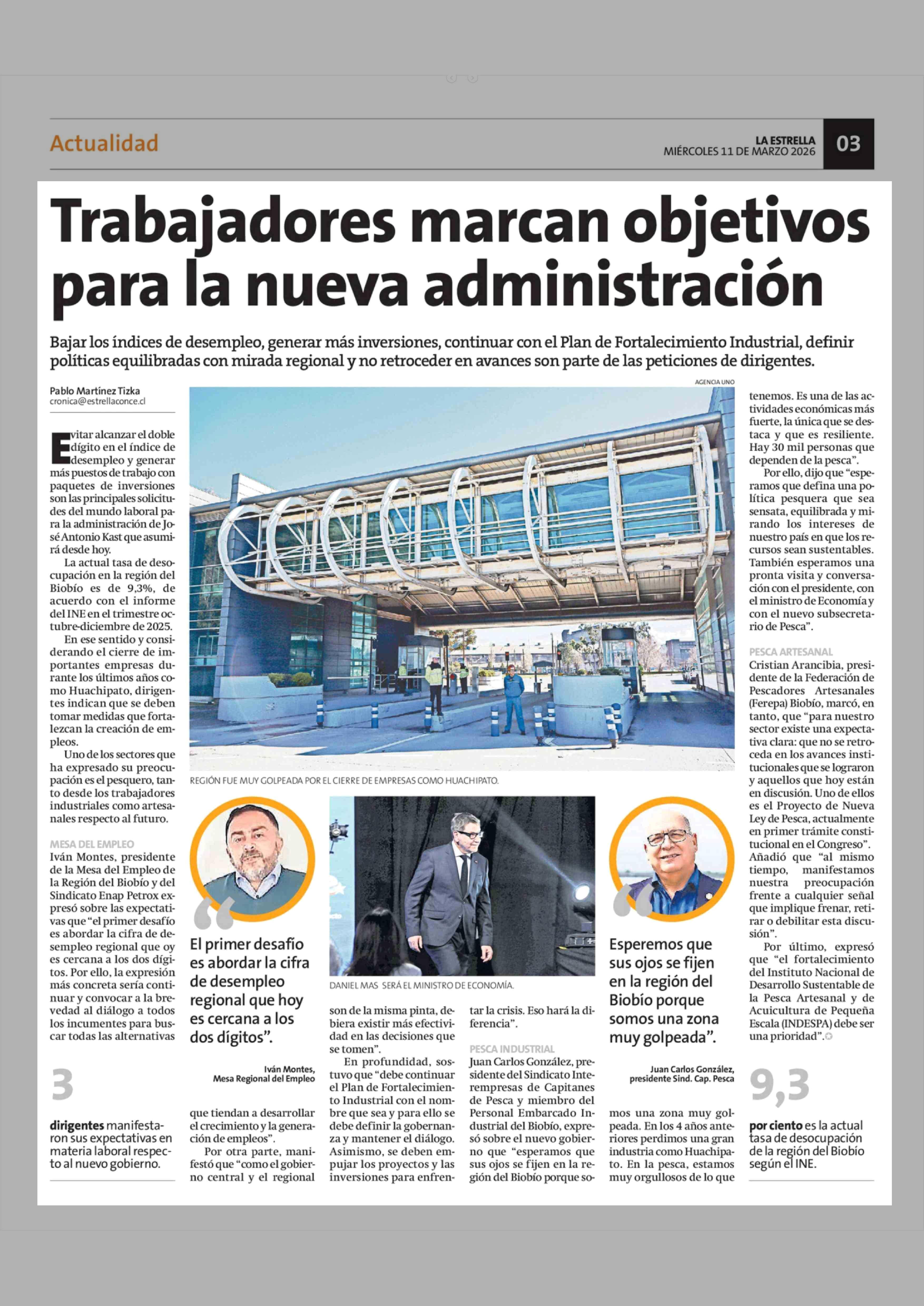 Trabajadores marcan objetivos para la nueva administración 11-03-2026 La Estrella de Concepción |