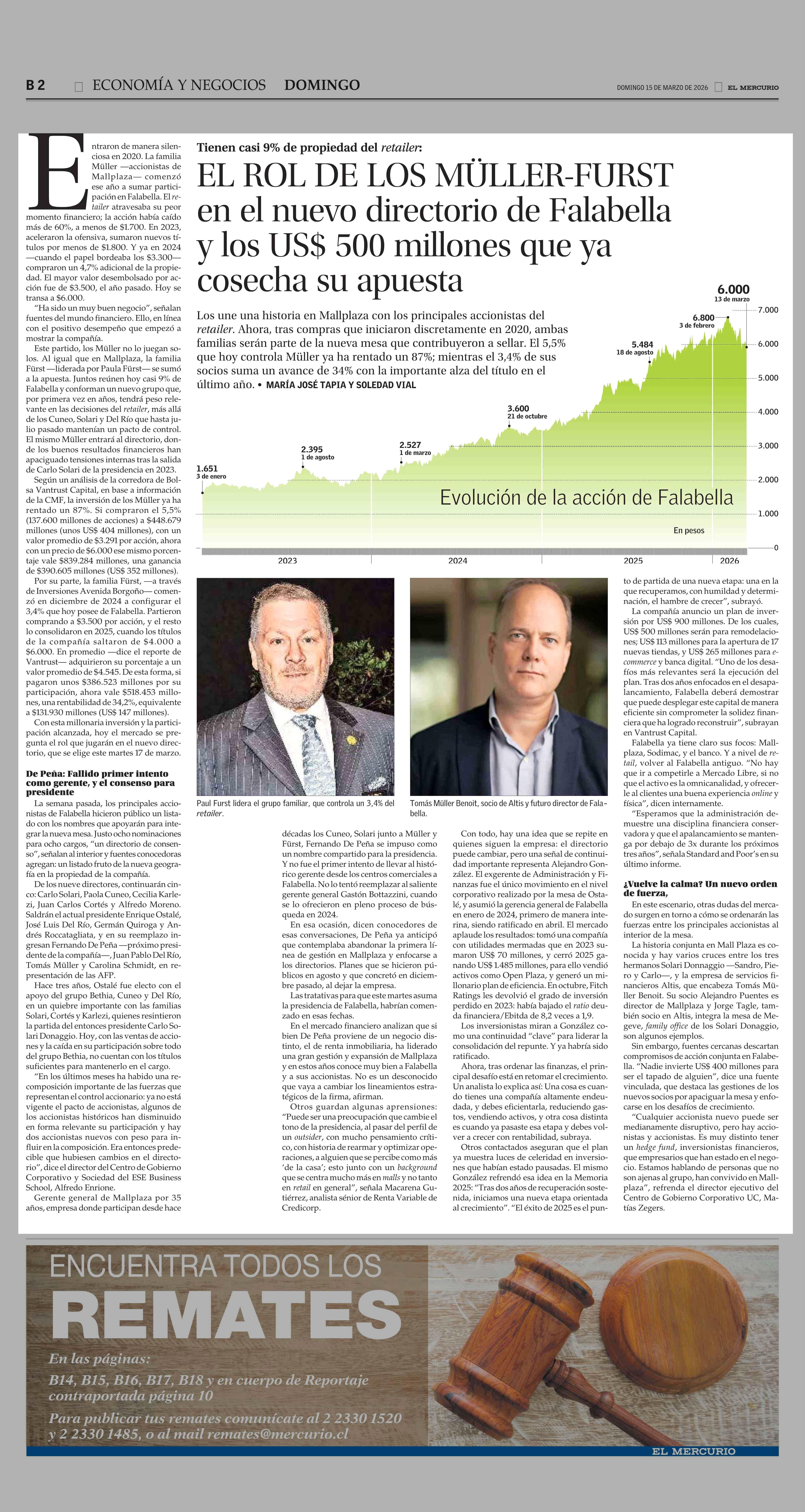 EL ROL DE LOS MÜLLER-FURST en el nuevo directorio de Falabella y los US$ 500 millones que ya cosecha su apuesta 15-03-2026 El Mercurio |