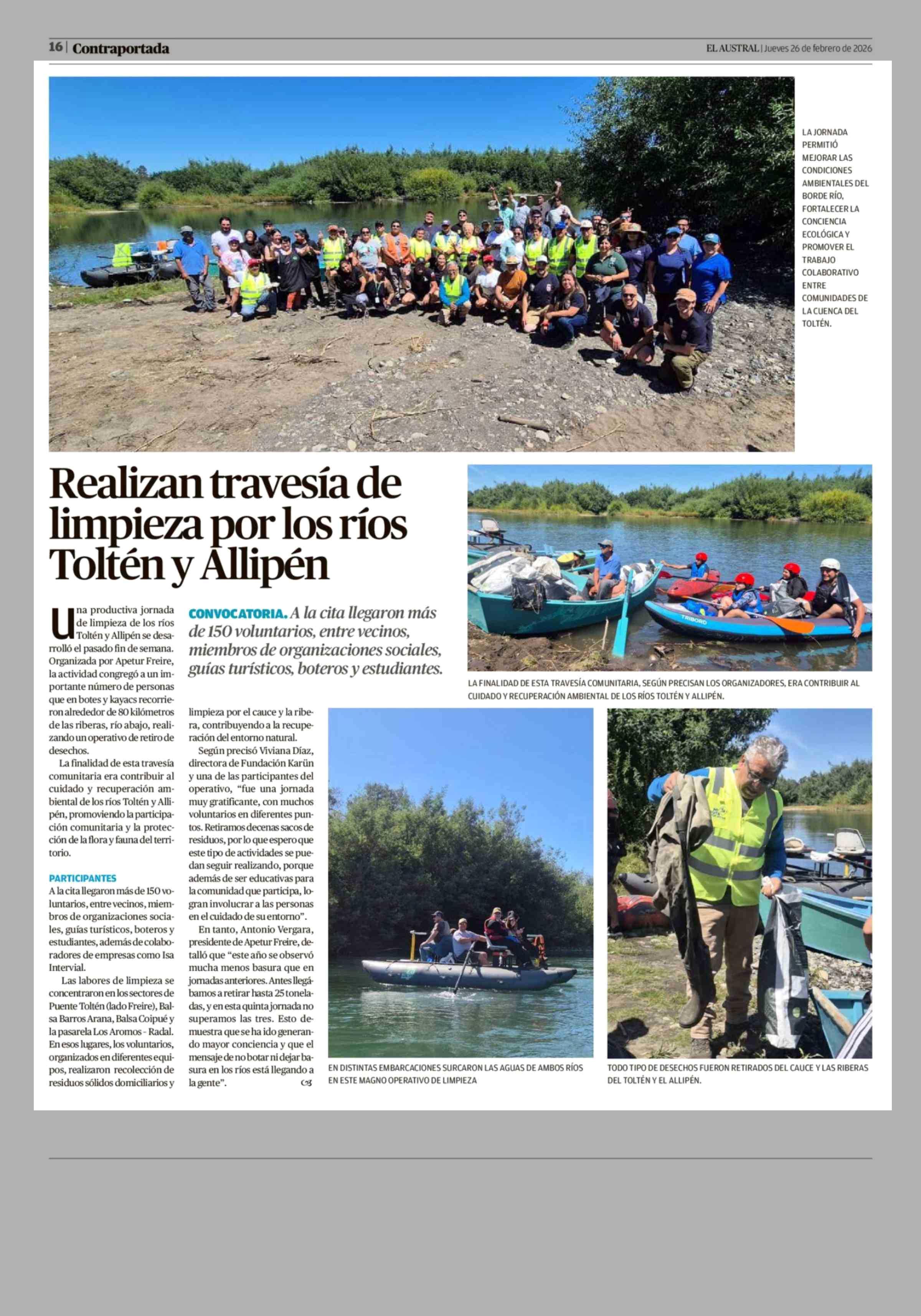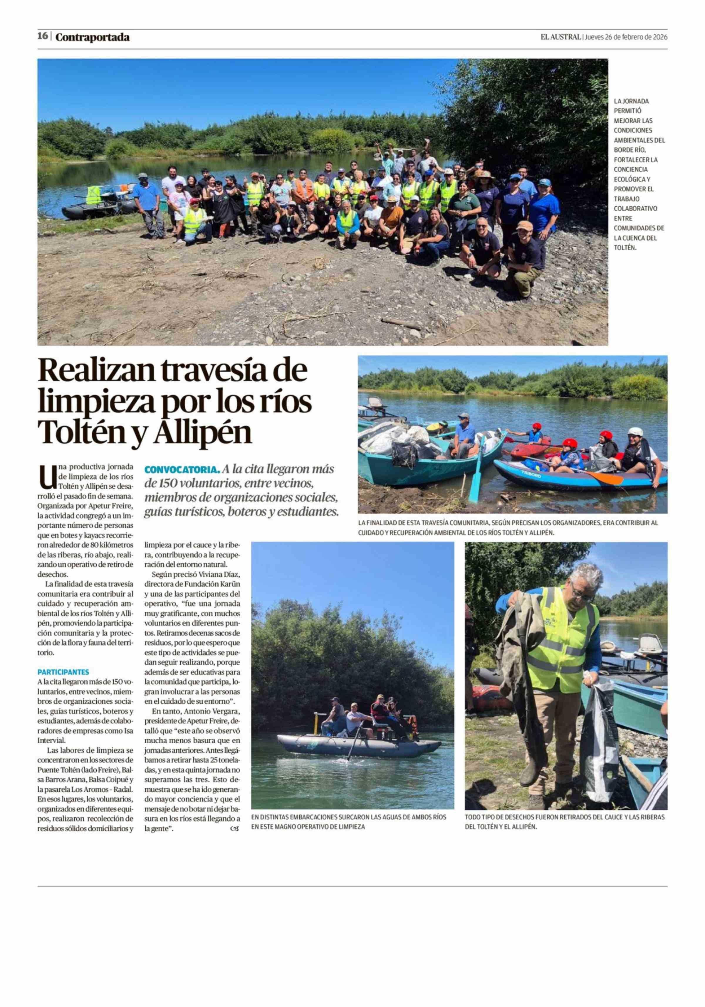 Realizan travesía de limpieza por los ríos Toltén y Allipén 26-02-2026 El Austral de la Araucanía |