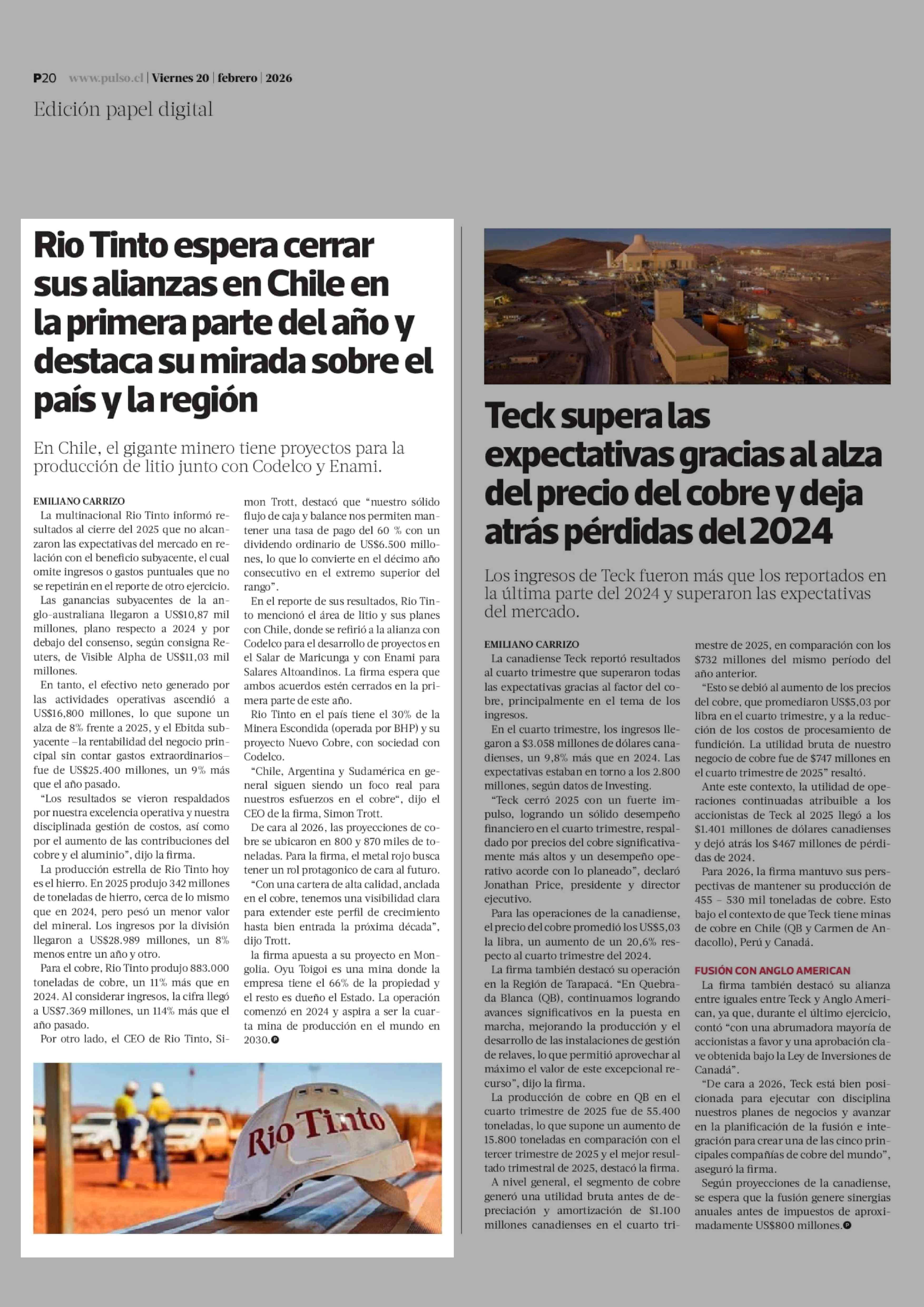 Rio Tinto espera cerrar sus alianzas en Chile en la primera parte del año y destaca su mirada sobre el país y la región 20-02-2026 La Tercera |