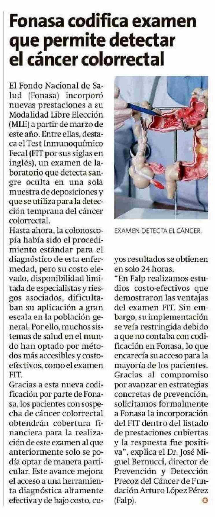 | Título: | Fonasa codifica examen que permite detectar el cáncer colorrectal |