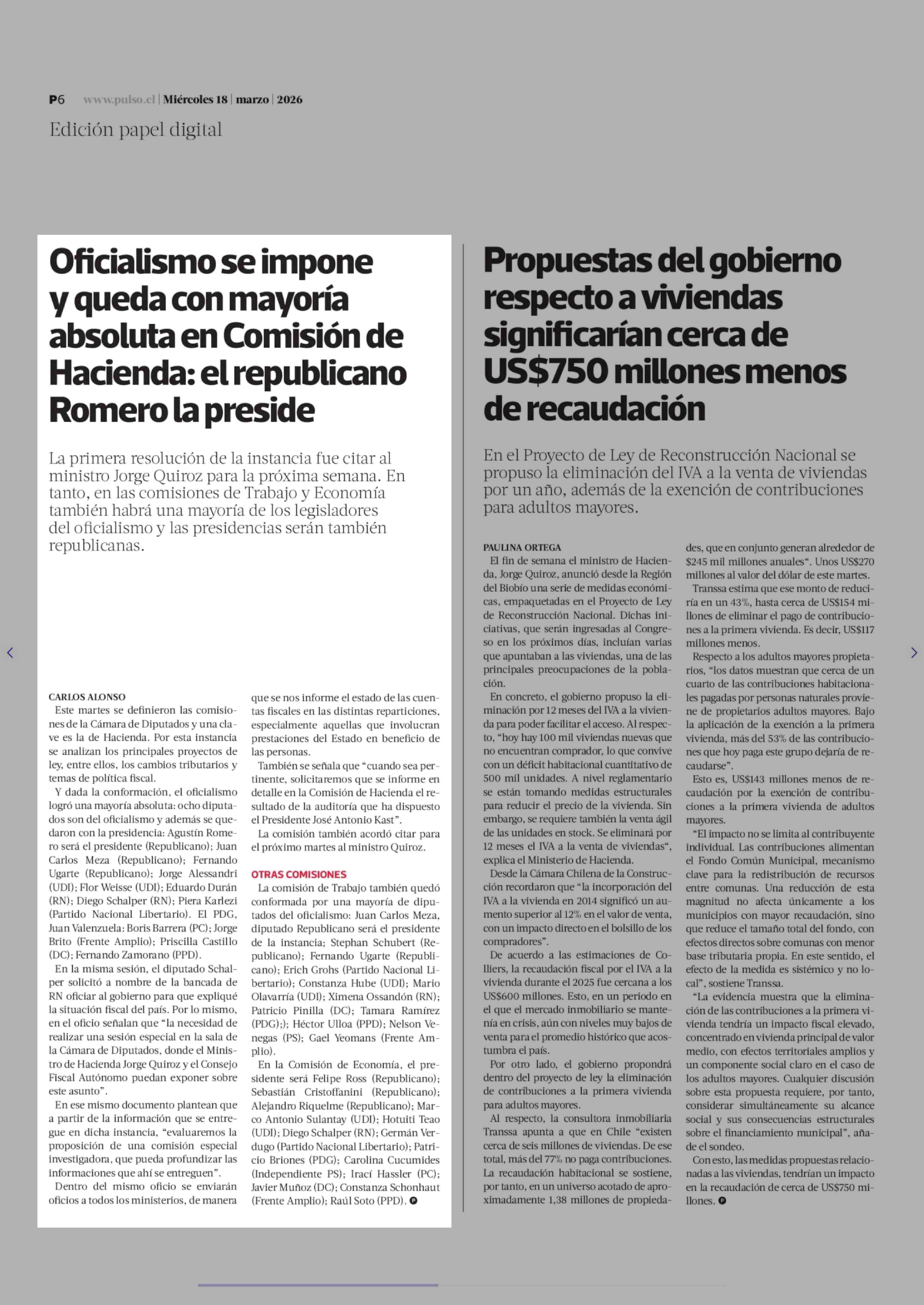 Título: Oficialismo se impone y queda con mayoría absoluta en Comisión de Hacienda: el republicano Romero la preside