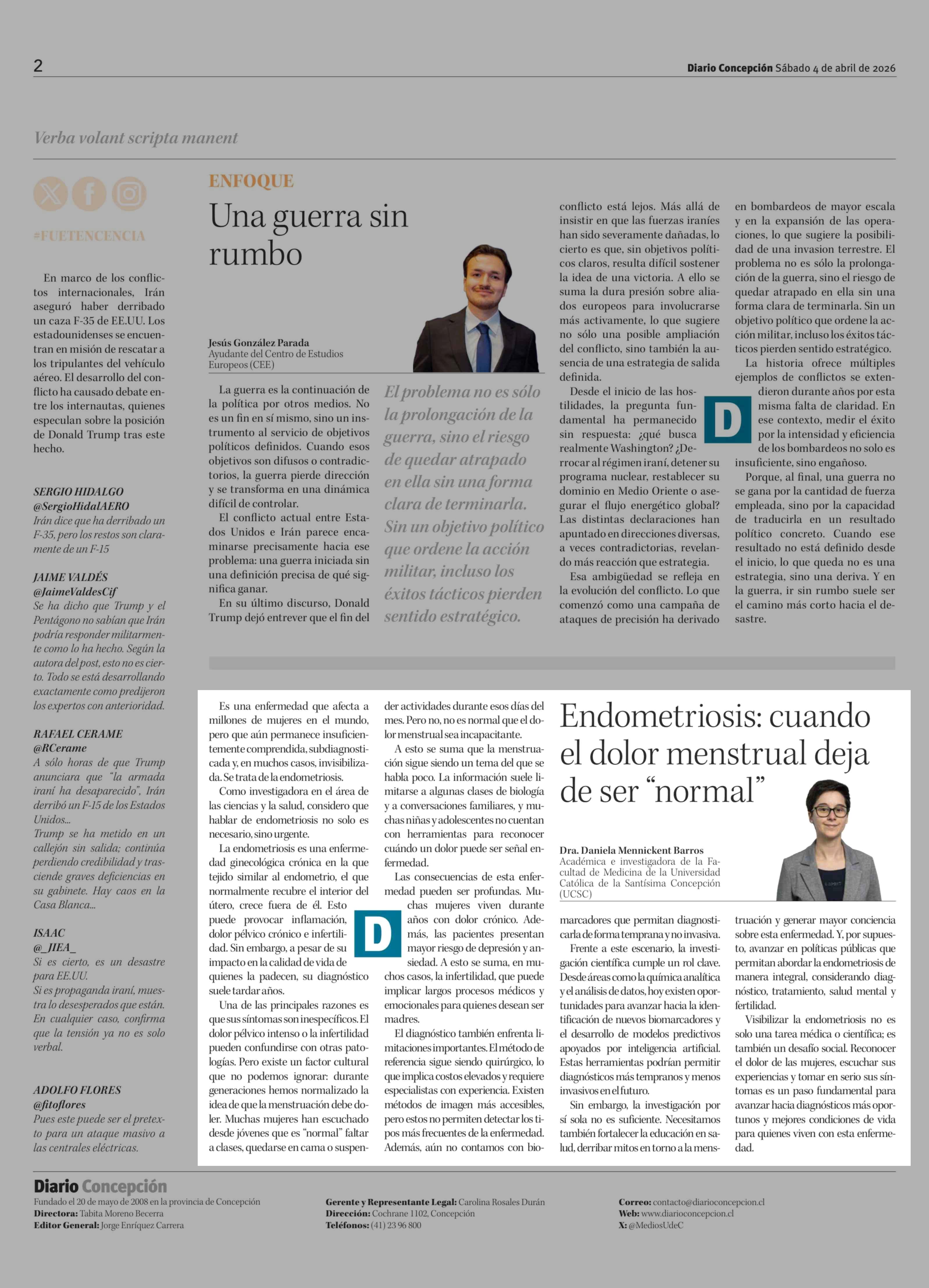 Columnas de Opinión: Endometriosis: cuando el dolor menstrual deja de ser "normal" 04-04-2026 Diario Concepción |