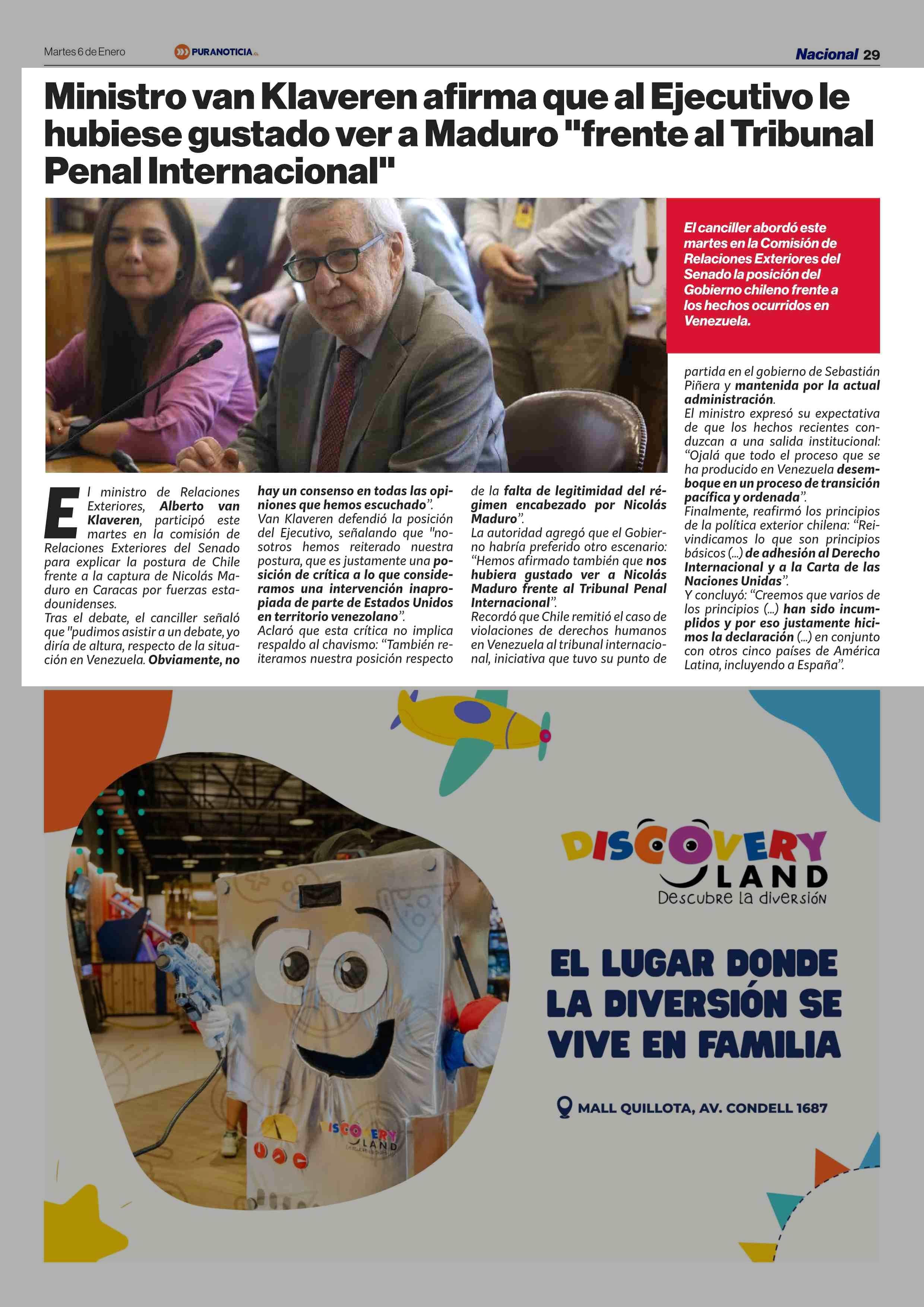 Ministro van Klaveren afirma que al Ejecutivo le hubiese gustado ver a Maduro “frente al Tribunal Penal Internacional” 06-01-2026 Puranoticia.cl |