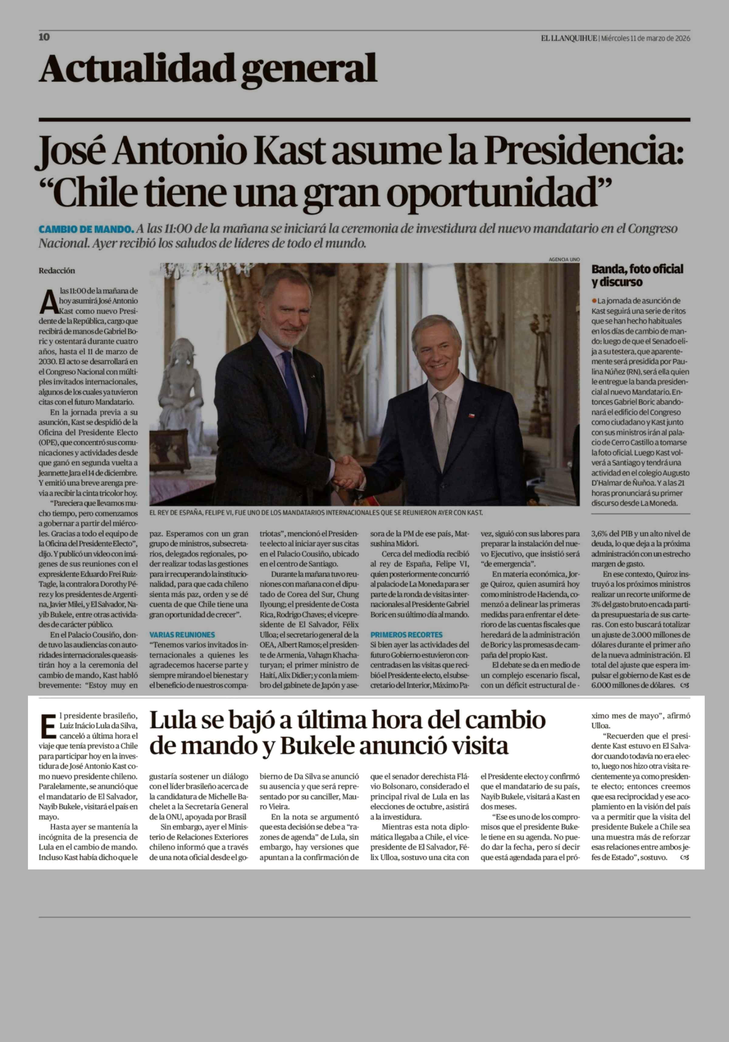 Lula se bajó a última hora del cambio de mando y Bukele anunció visita 11-03-2026 El Llanquihue |