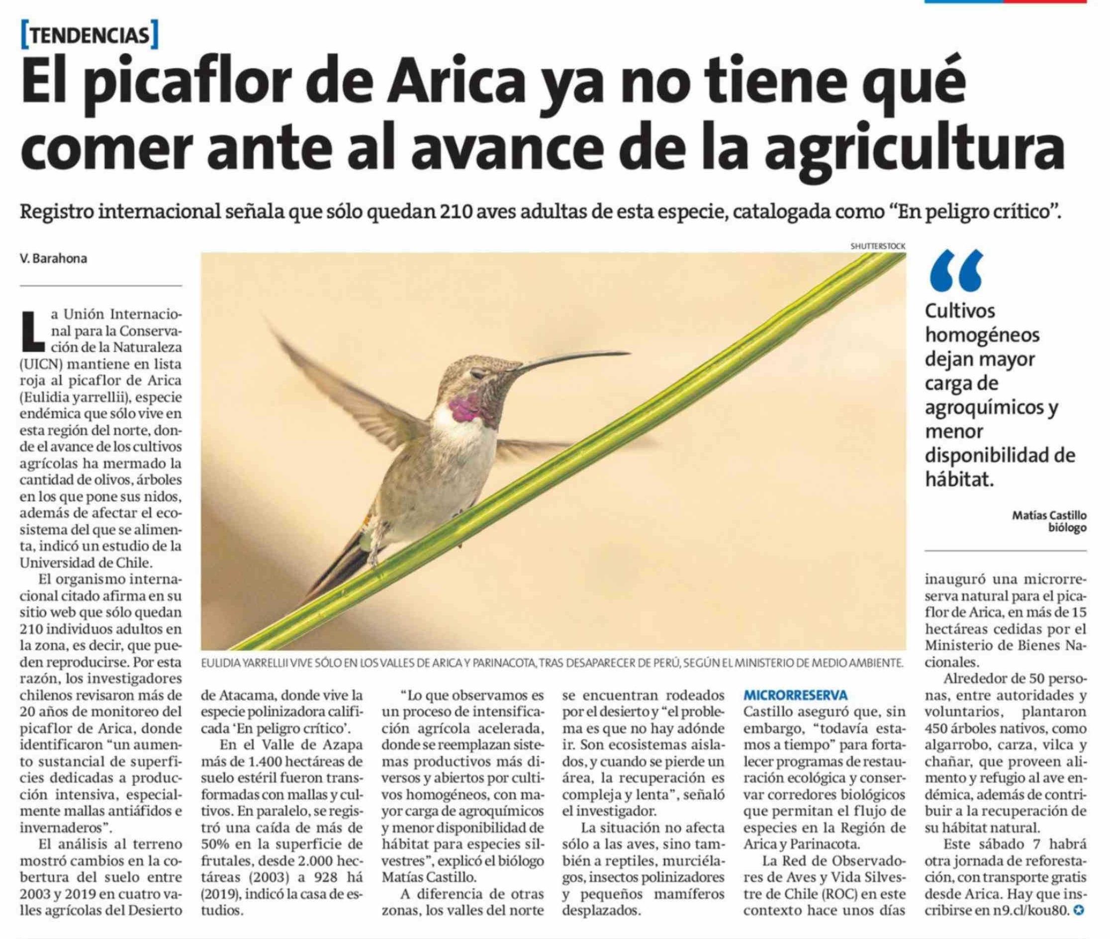 Título: El picaflor de Arica ya no tiene qué comer ante al avance de la agricultura
