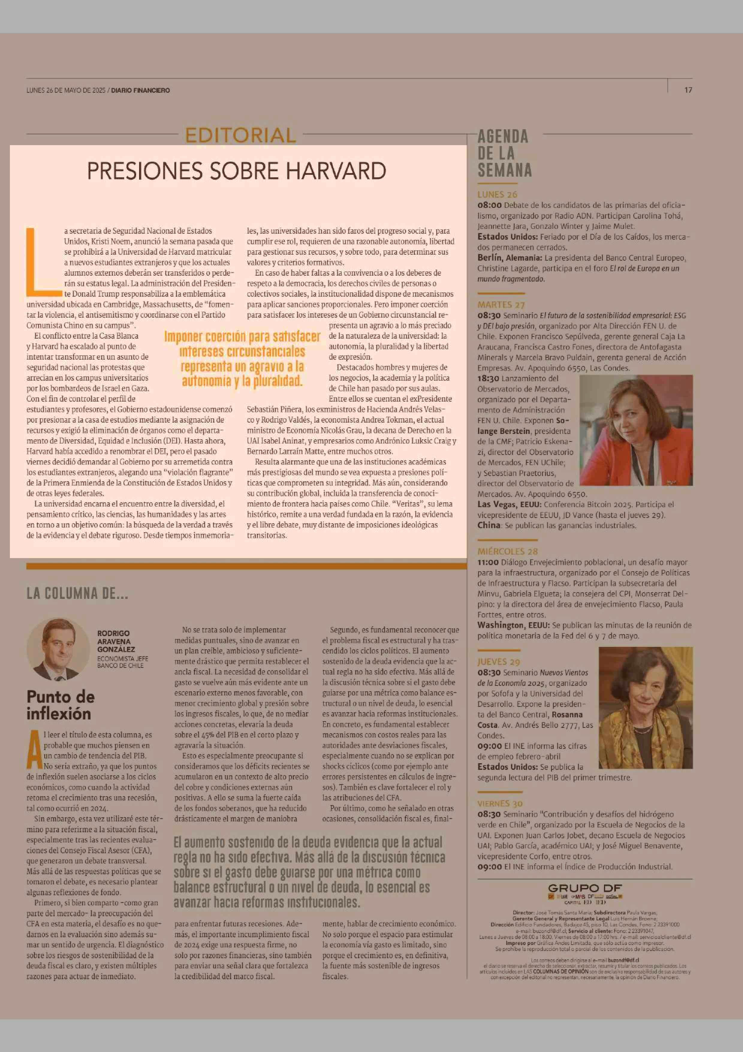 EDITORIAL: PRESIONES SOBRE HARVARD 26-05-2025 Diario Financiero |