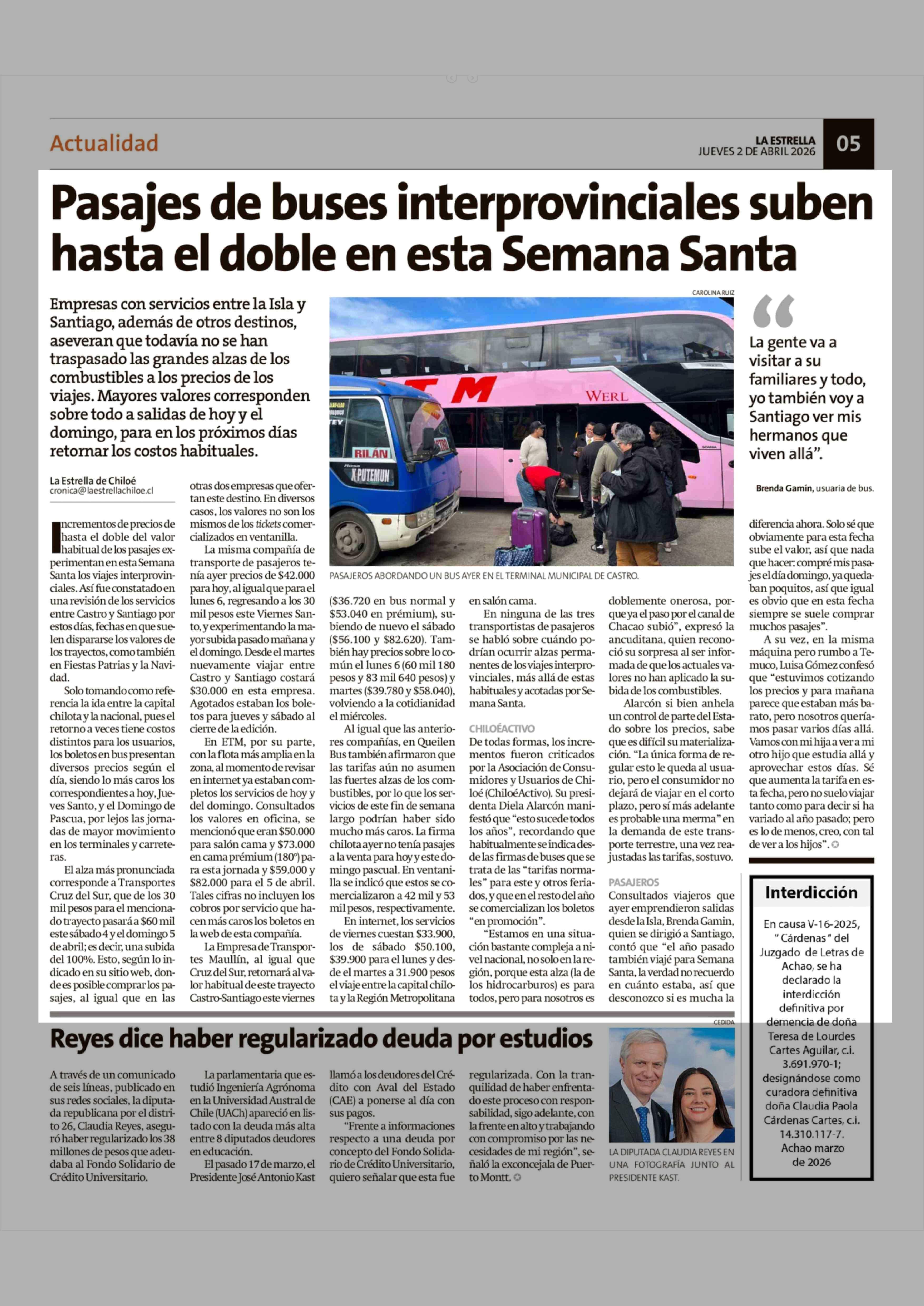 Pasajes de buses interprovinciales suben hasta el doble en esta Semana Santa 02-04-2026 La Estrella de Chiloé |