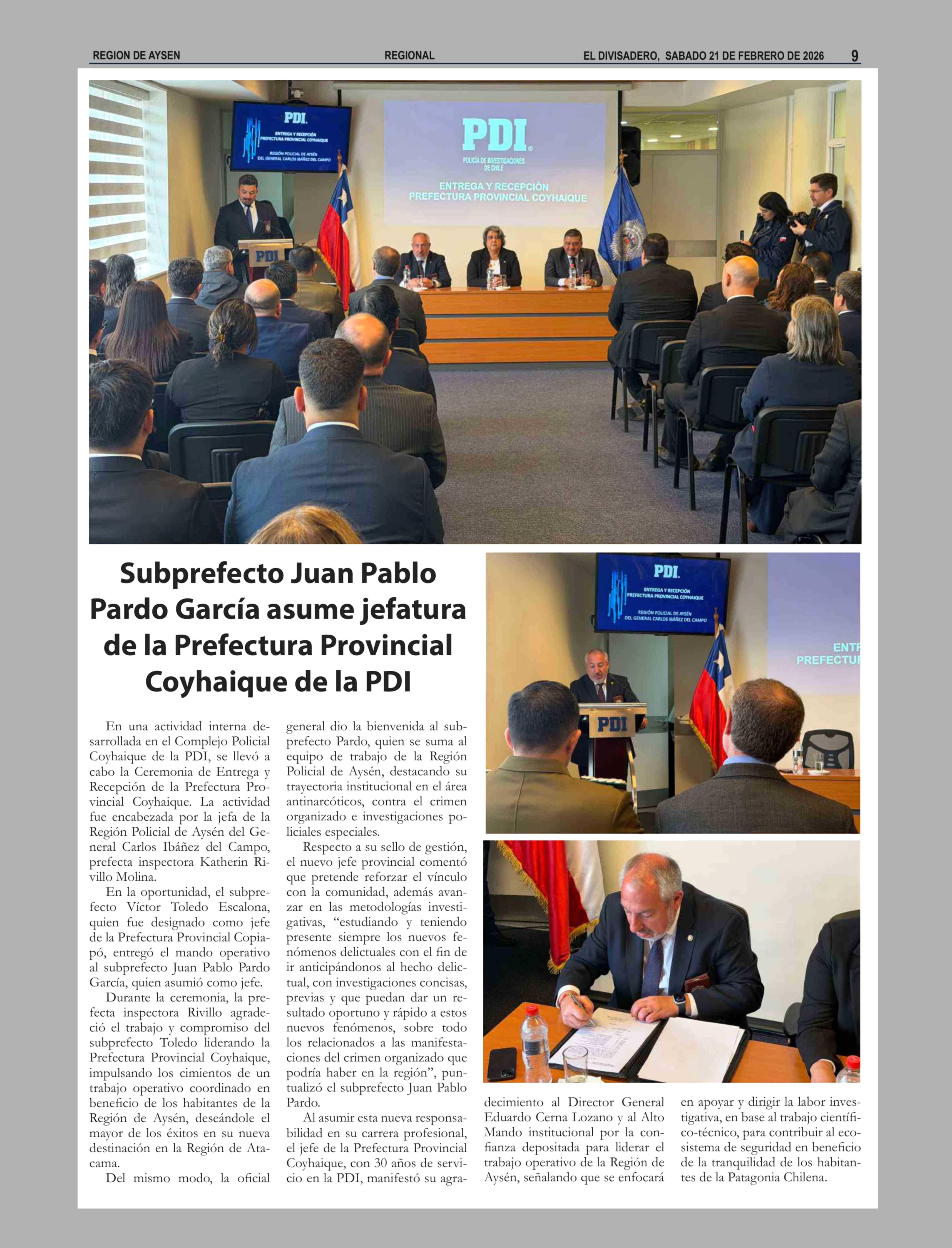 Subprefecto Juan Pablo Pardo García asume jefatura de la Prefectura Provincial Coyhaique de la PDI 21-02-2026 El Divisadero |