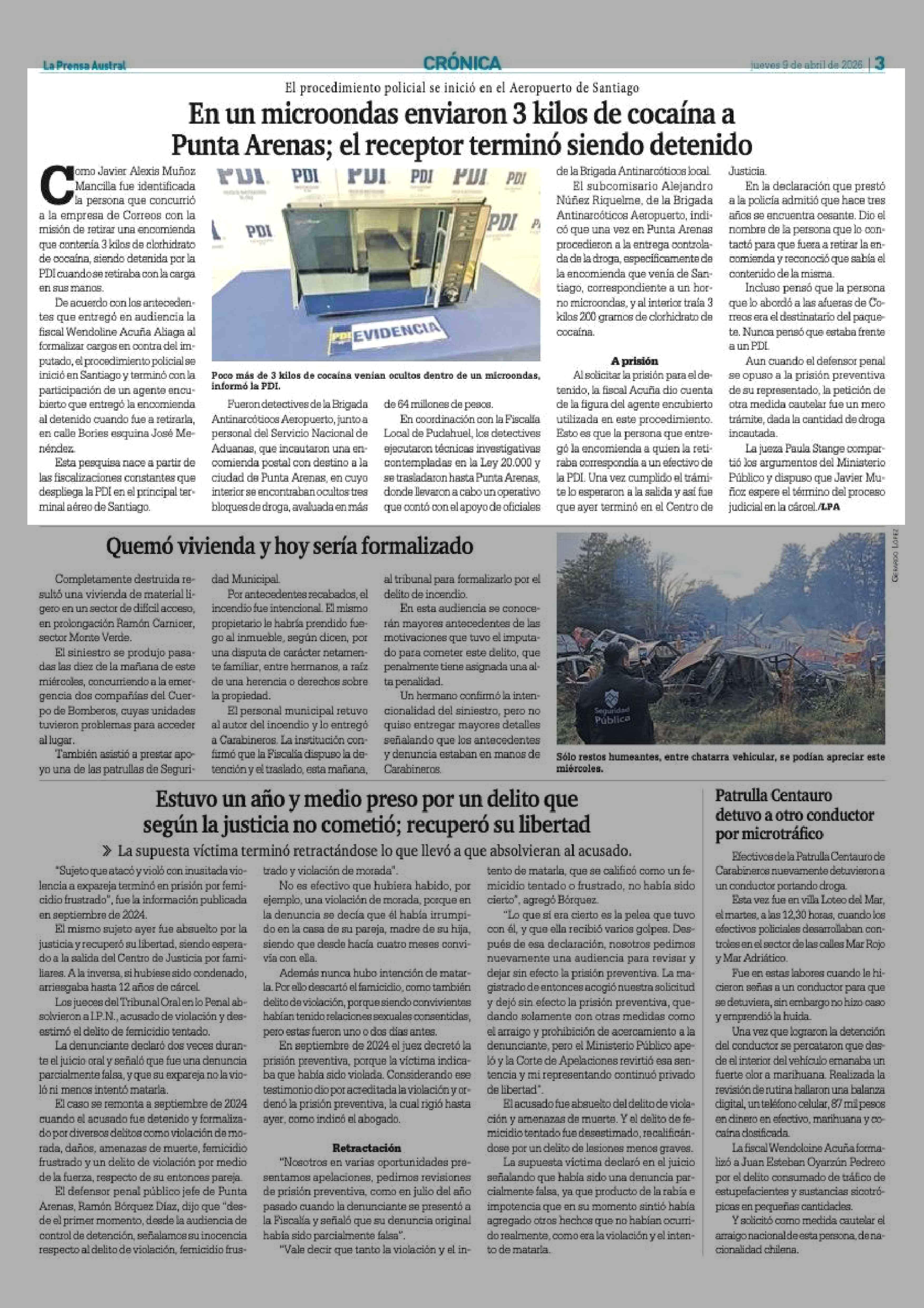 En un microondas enviaron 3 kilos de cocaína a Punta Arenas; el receptor terminó siendo detenido 09-04-2026 La Prensa Austral |