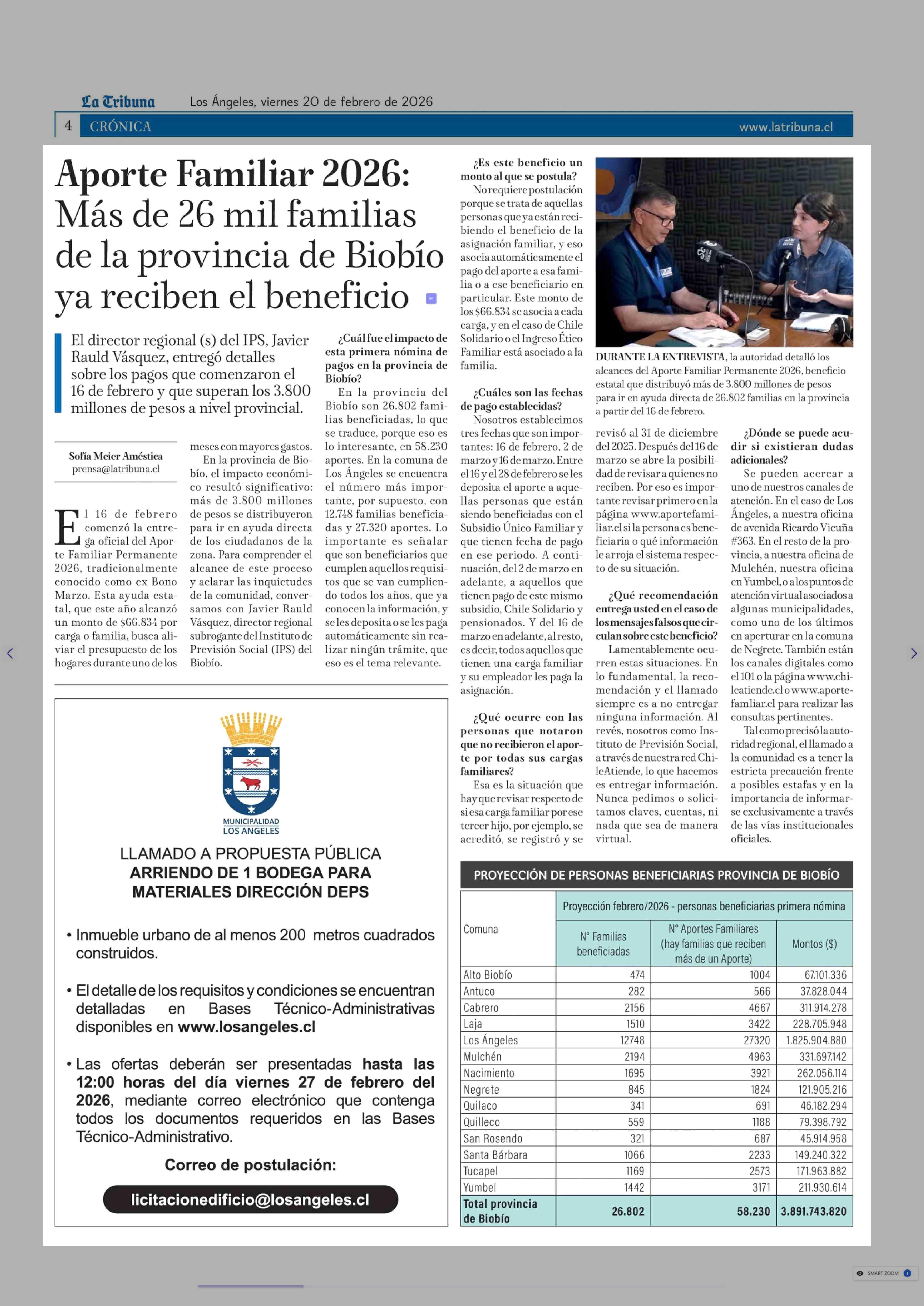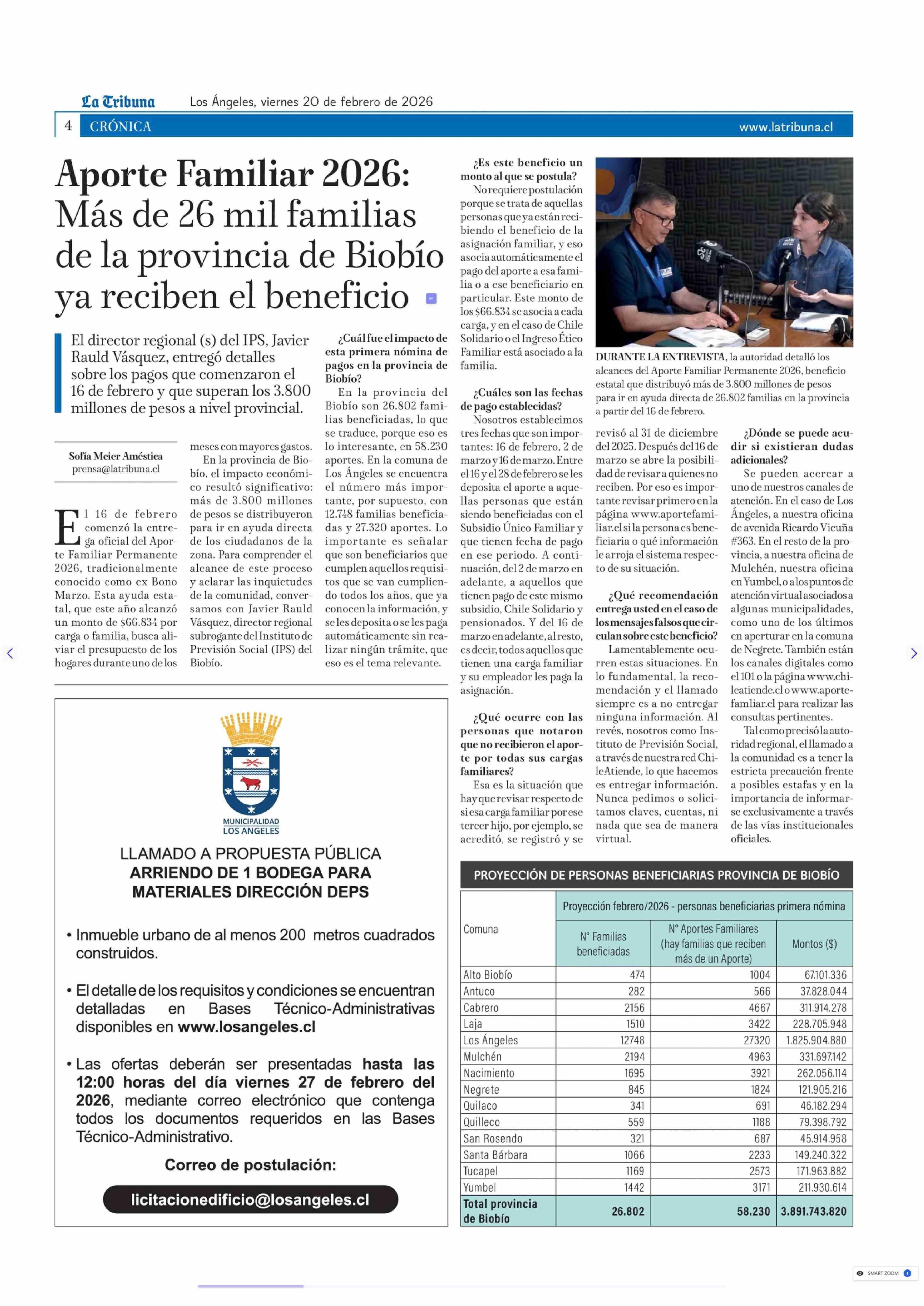 Aporte Familiar 2026: Más de 26 mil familias de la provincia de Biobío ya reciben el beneficio 20-02-2026 La Tribuna |