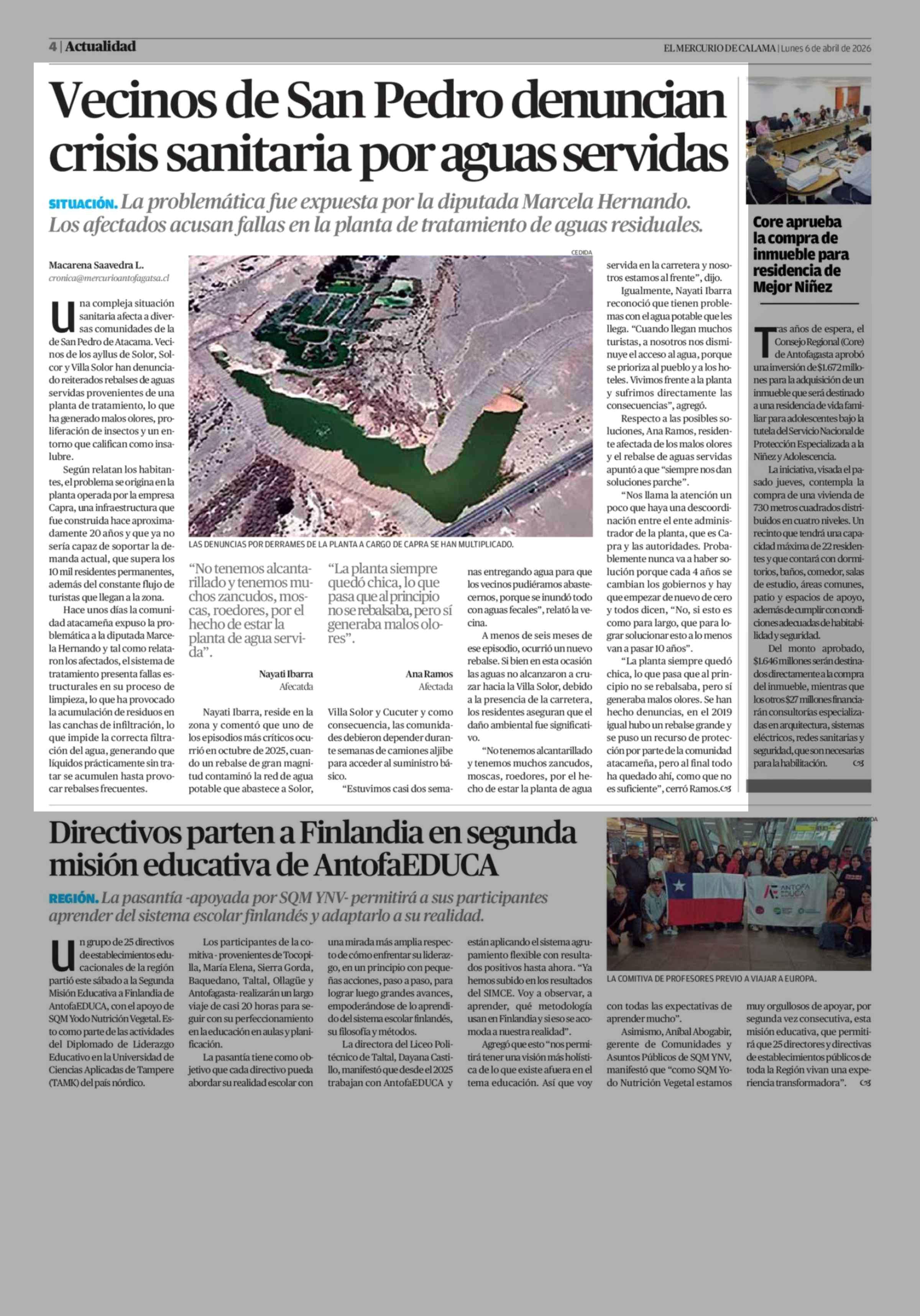 Vecinos de San Pedro denuncian crisis sanitaria por aguas servidas 06-04-2026 El Mercurio de Calama |