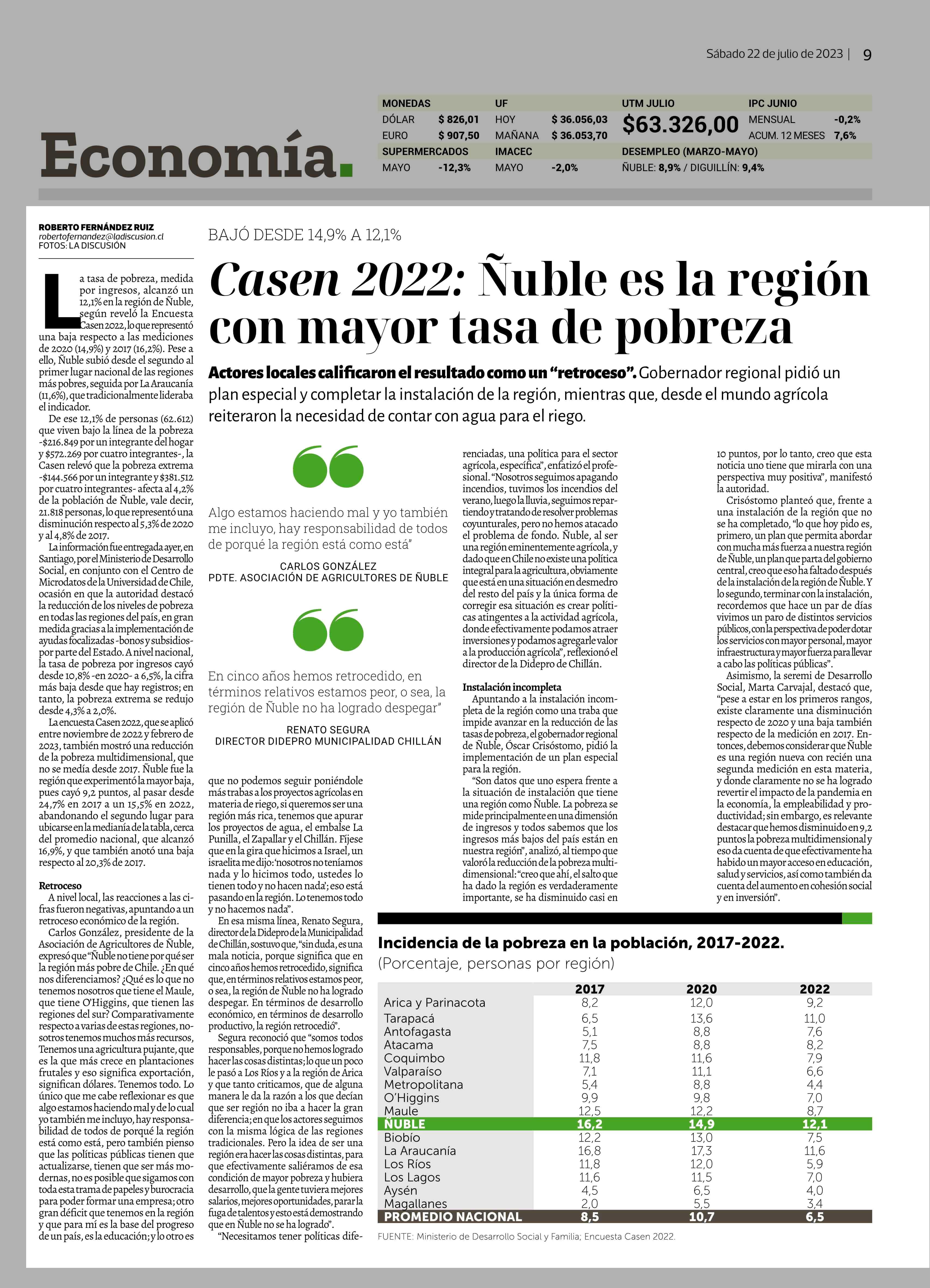 Casen 2022: Ñuble es la región con mayor tasa de pobreza 28-07-2023 La Discusión |