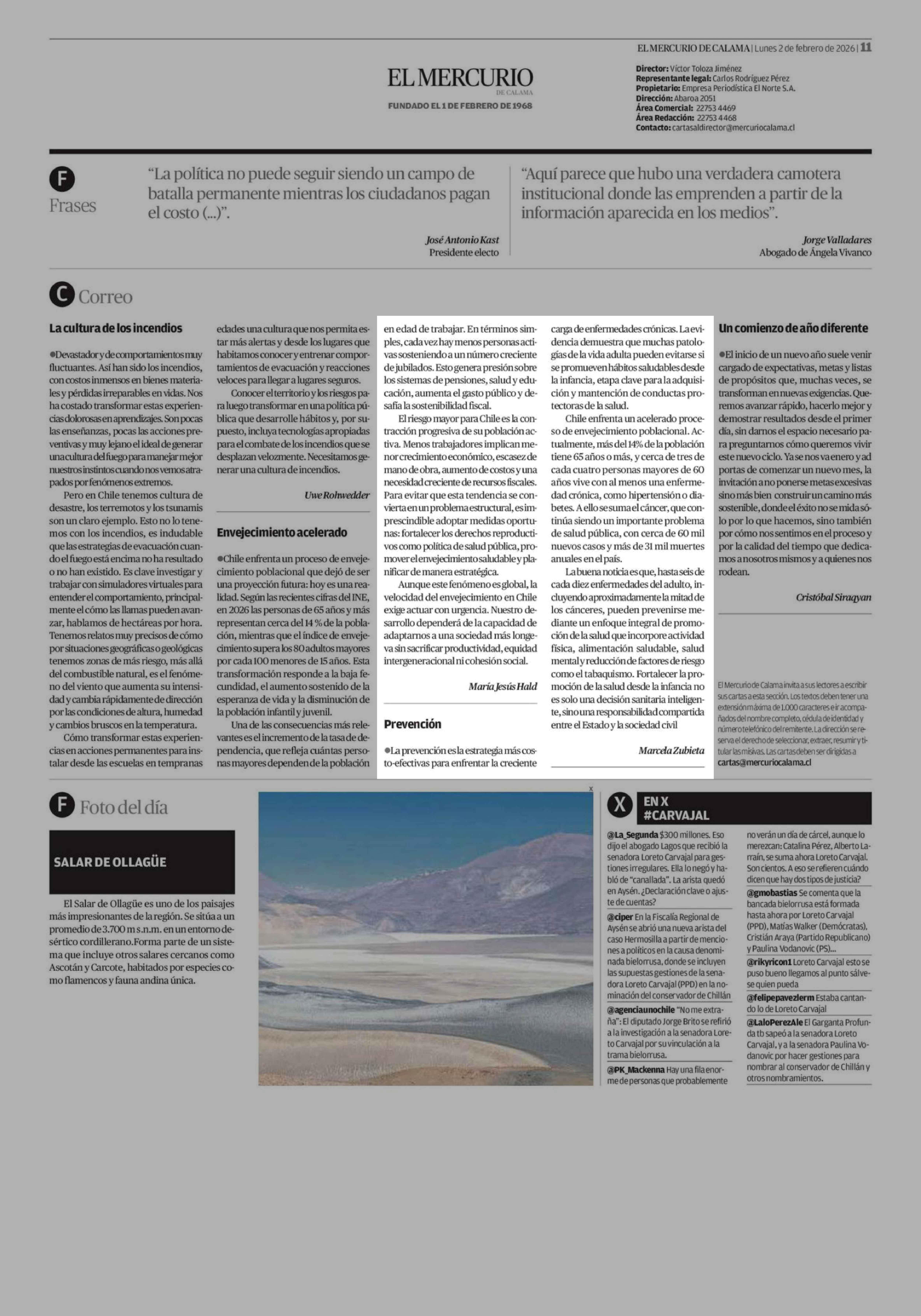 Cartas: Prevención 02-02-2026 El Mercurio de Calama |