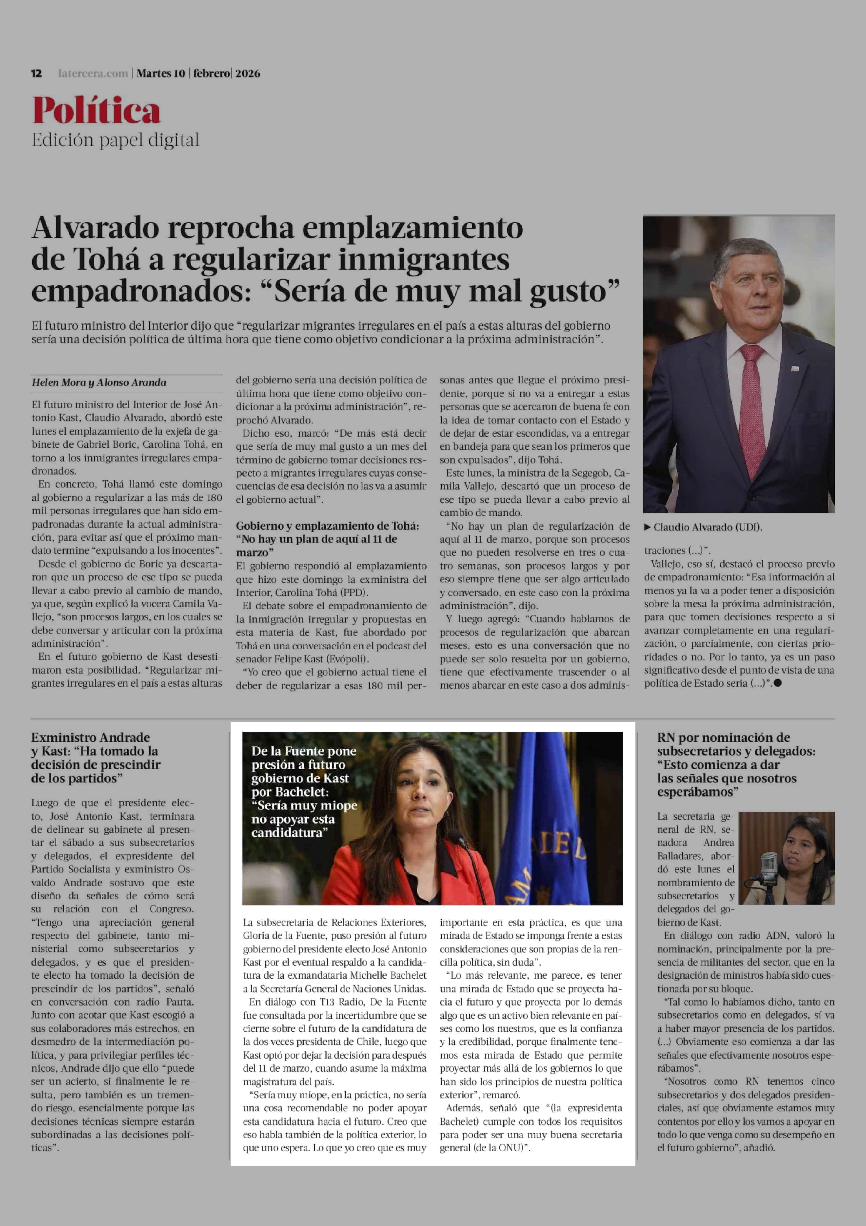 De la Fuente pone presión a futuro gobierno de Kast por Bachelet: "Sería muy miope no apoyar esta candidatura" 10-02-2026 La Tercera |