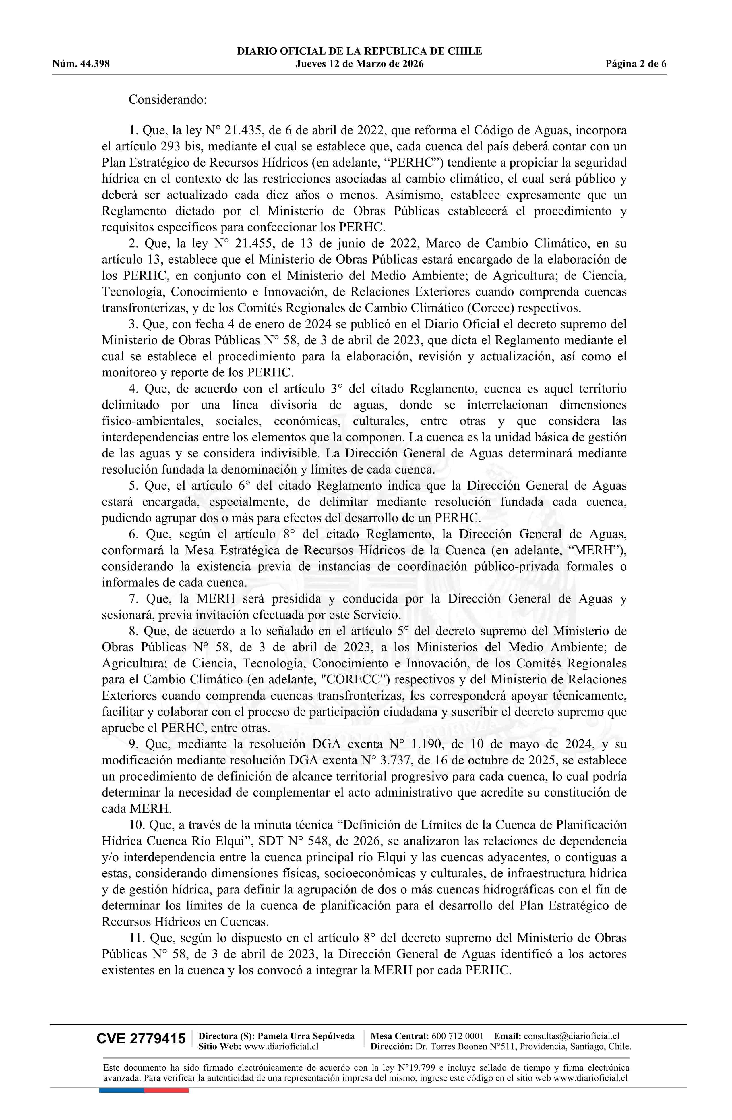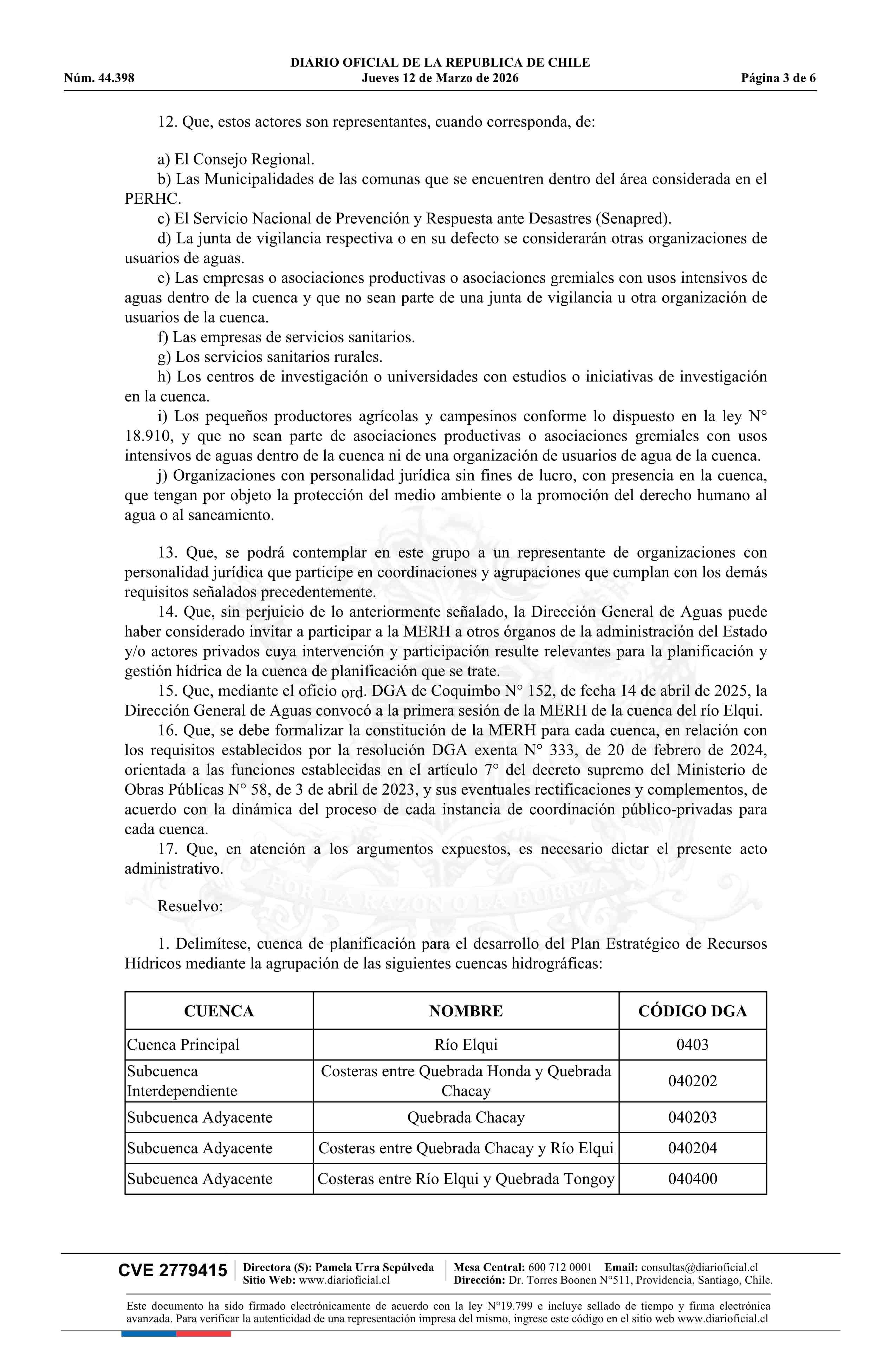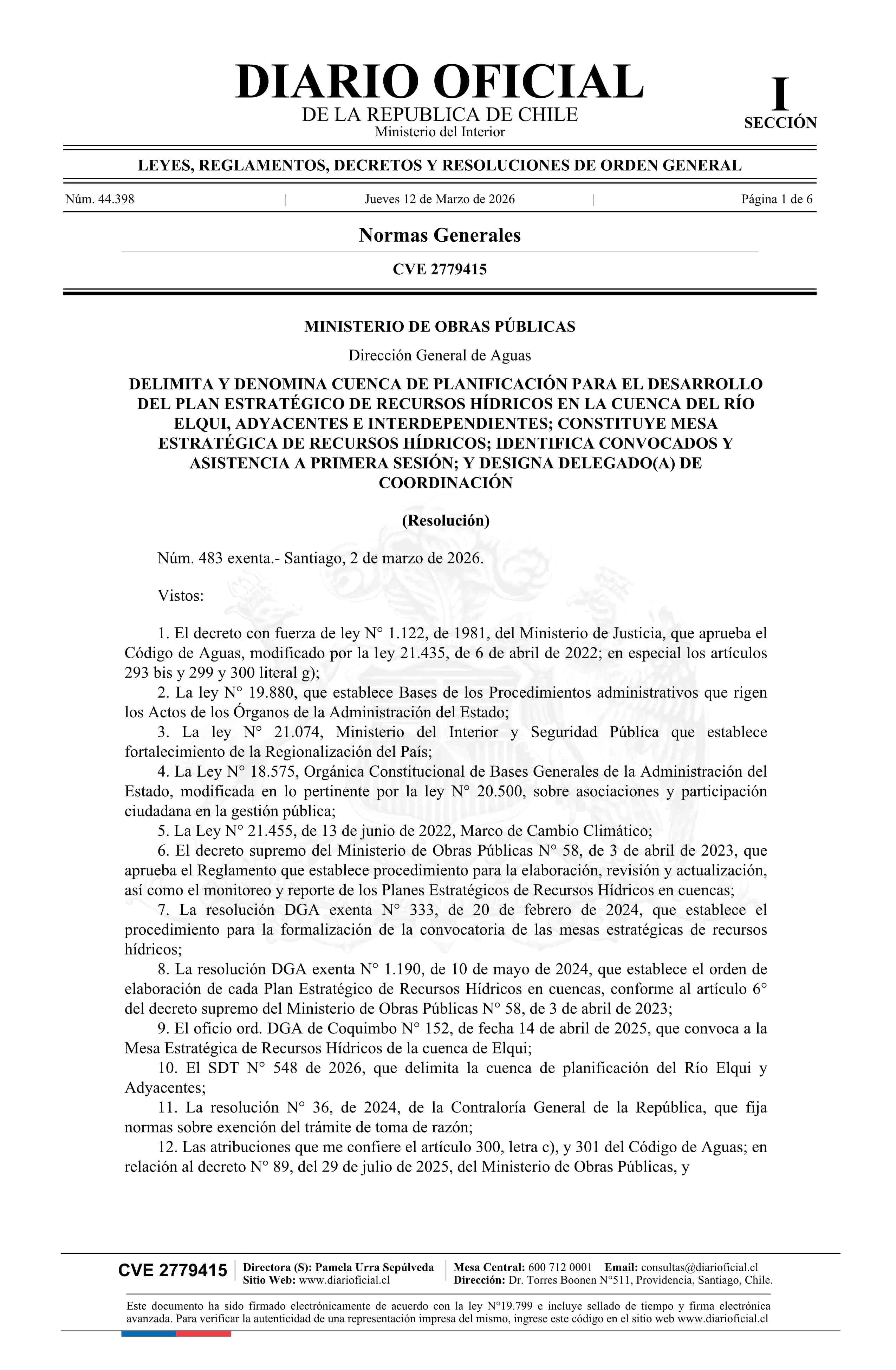Título: Resolución exenta número 483, de 2026.- Delimita y denomina cuenca de planificación para el desarrollo del Plan Estratégico de Recursos Hídricos en la cuenca del Río Elqui, adyacentes e interdependientes; constituye Mesa Estratégica de Recursos Hídricos; identifica convocados y asistencia a primera