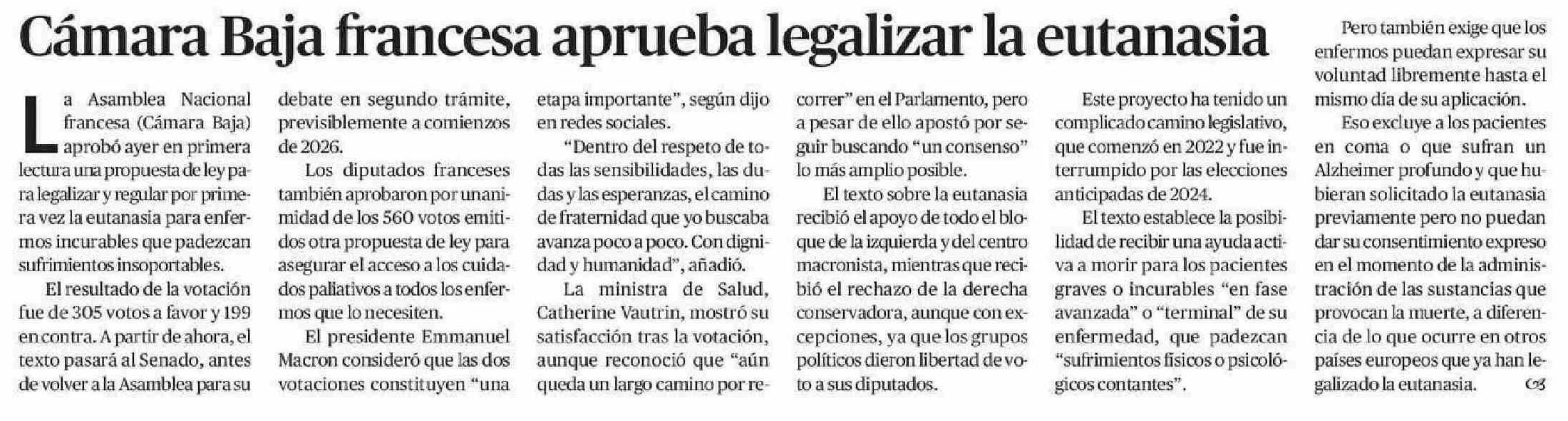 Cámara Baja francesa aprueba legalizar la eutanasia 28-05-2025 El Diario de Atacama |