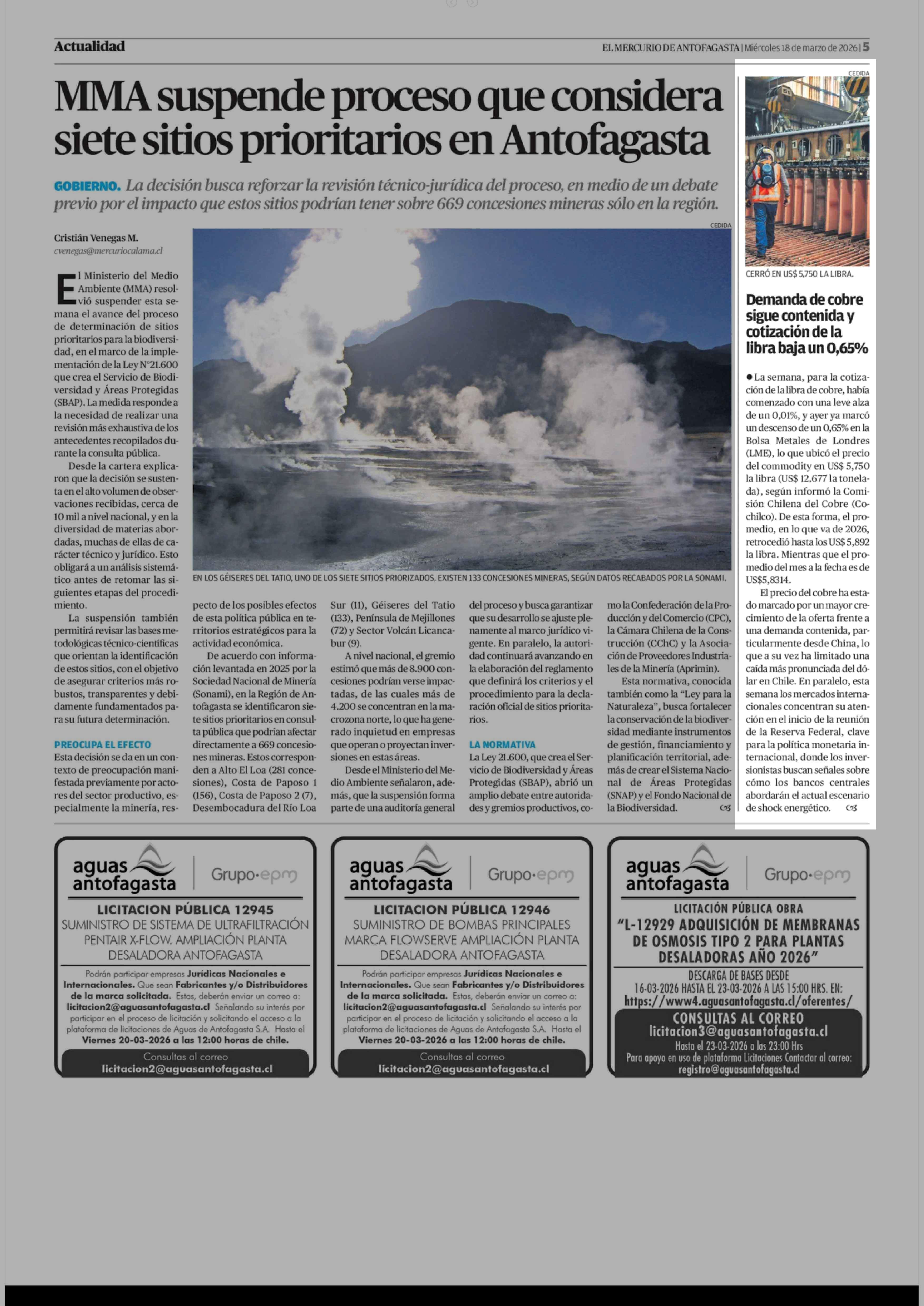 Demanda de cobre sigue contenida y cotización de la libra baja un 0,65% 18-03-2026 El Mercurio de Antofagasta |