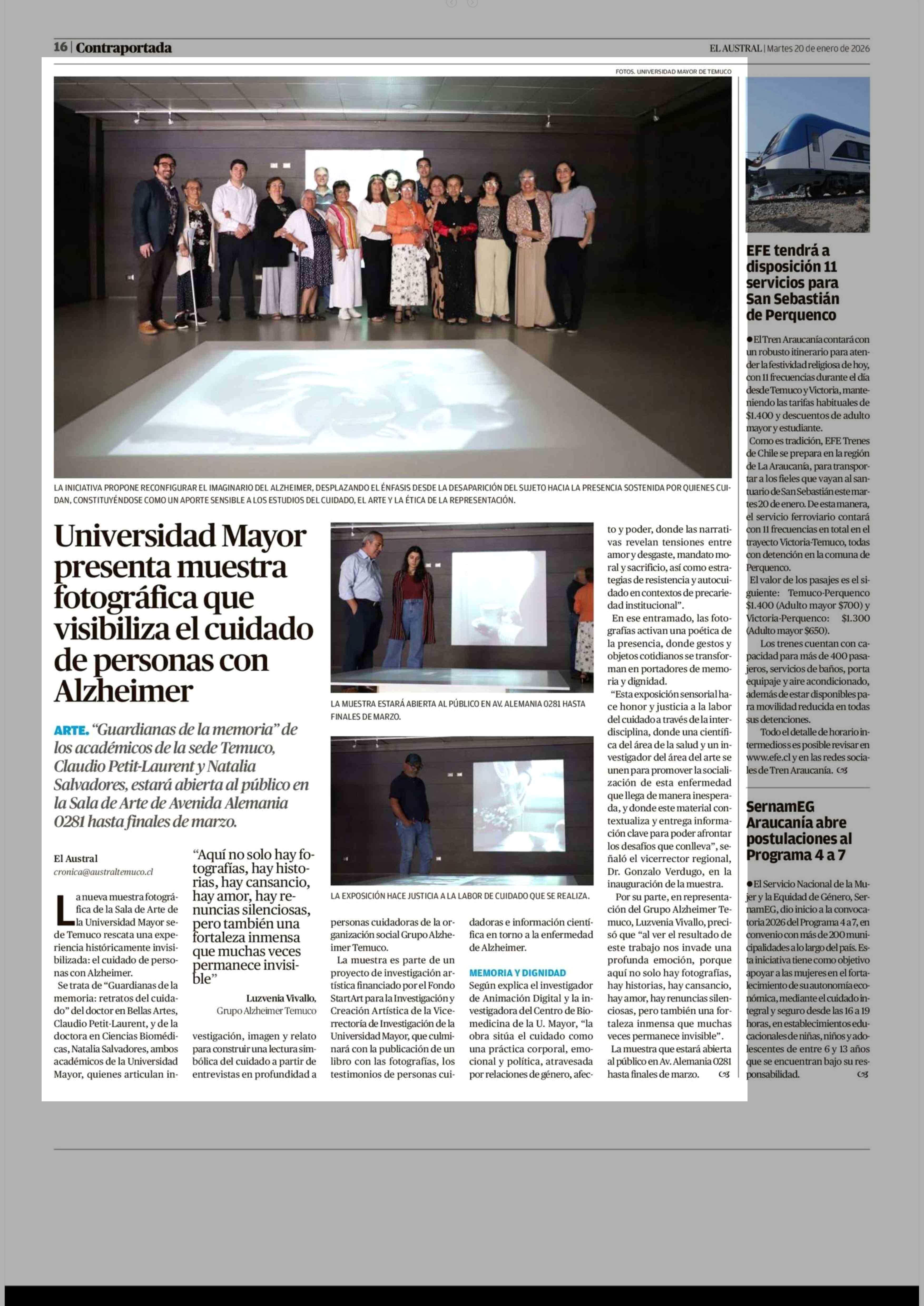 Universidad Mayor presenta muestra fotográfica que visibiliza el cuidado de personas con Alzheimer 20-01-2026 El Austral de la Araucanía |