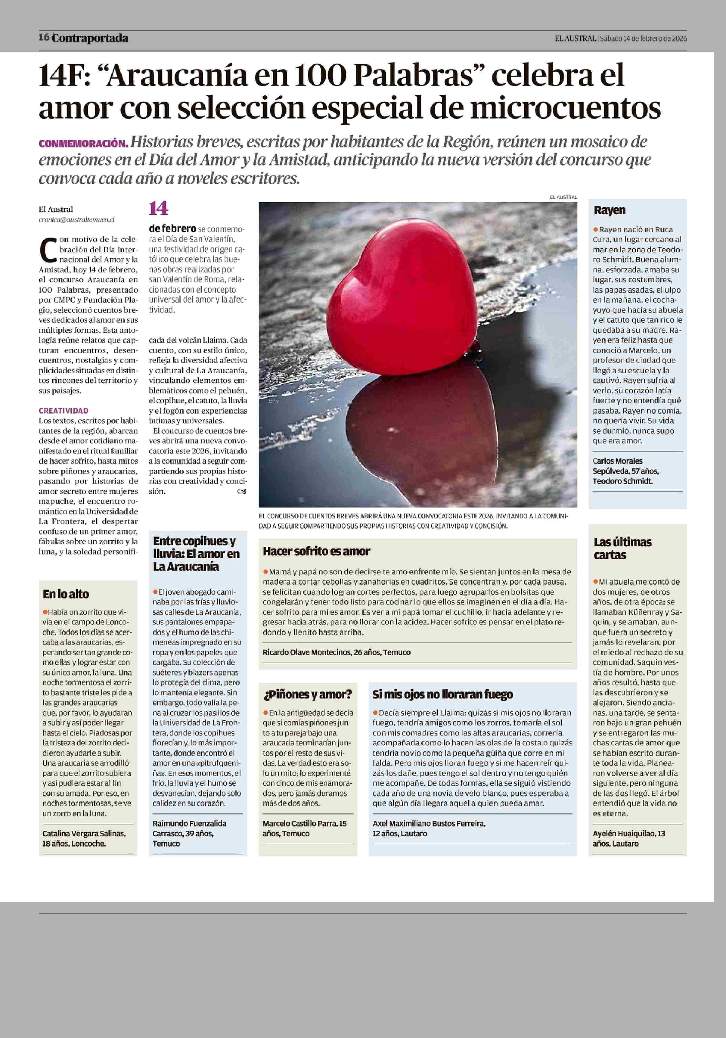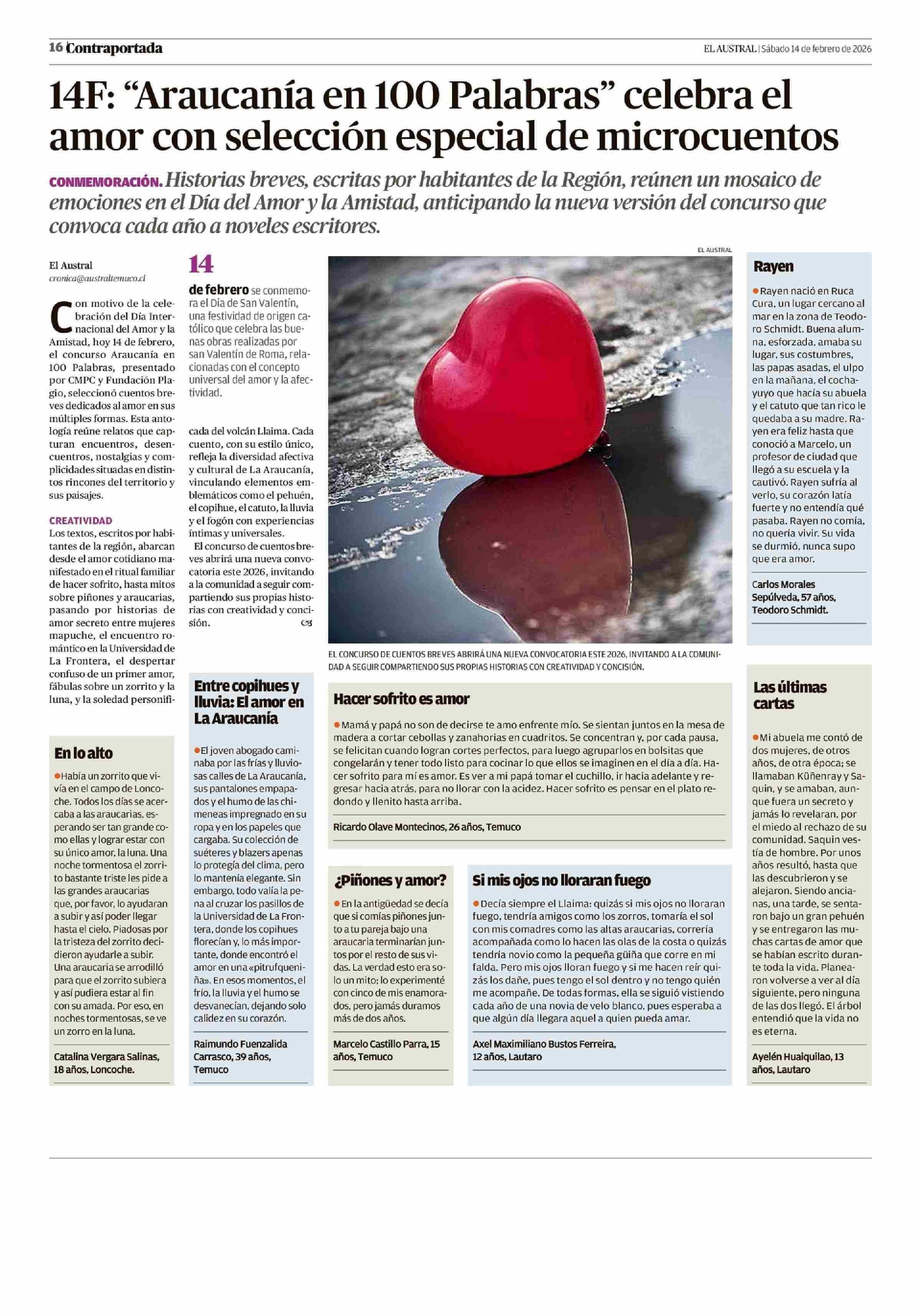 14F: "Araucanía en 100 Palabras" celebra el amor con selección especial de microcuentos 14-02-2026 El Austral de la Araucanía |