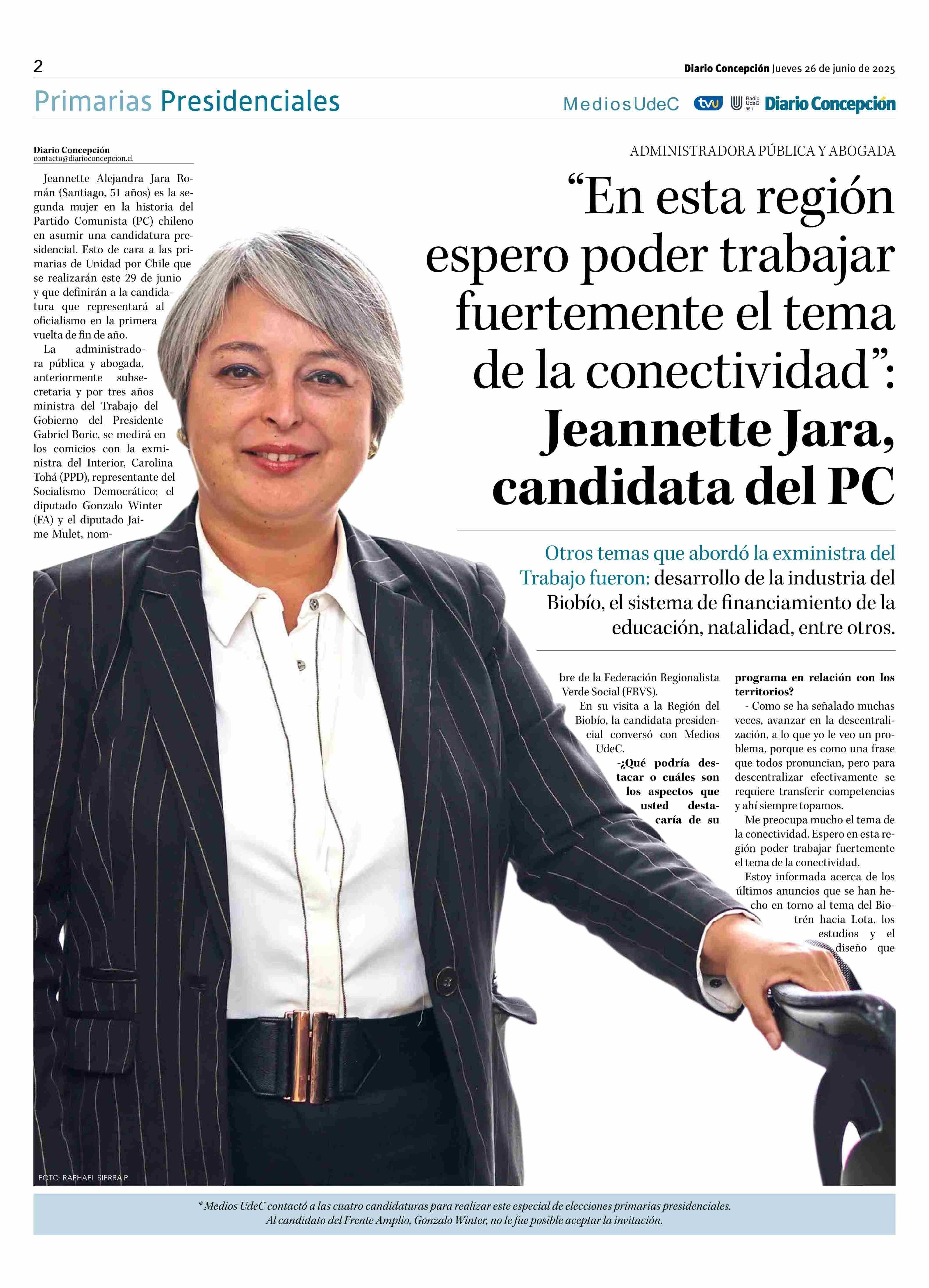 "En esta región espero poder trabajar fuertemente el tema de la conectividad": Jeannette Jara, candidata del PC 26-06-2025 Diario Concepción |