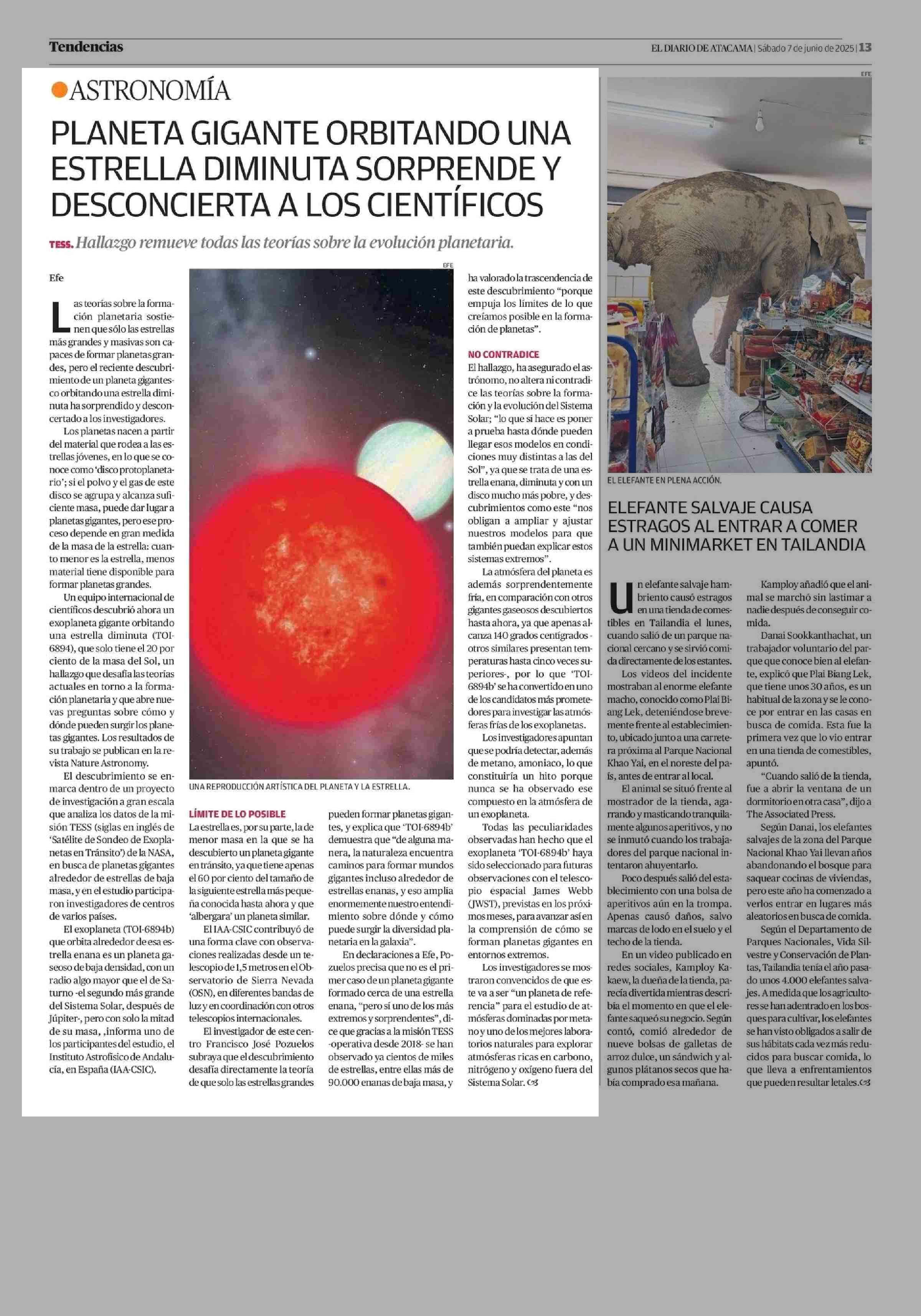 PLANETA GIGANTE ORBITANDO UNA ESTRELLA DIMINUTA SORPRENDE Y DESCONCIERTA A LOS CIENTIFICOS 07-06-2025 El Diario de Atacama |