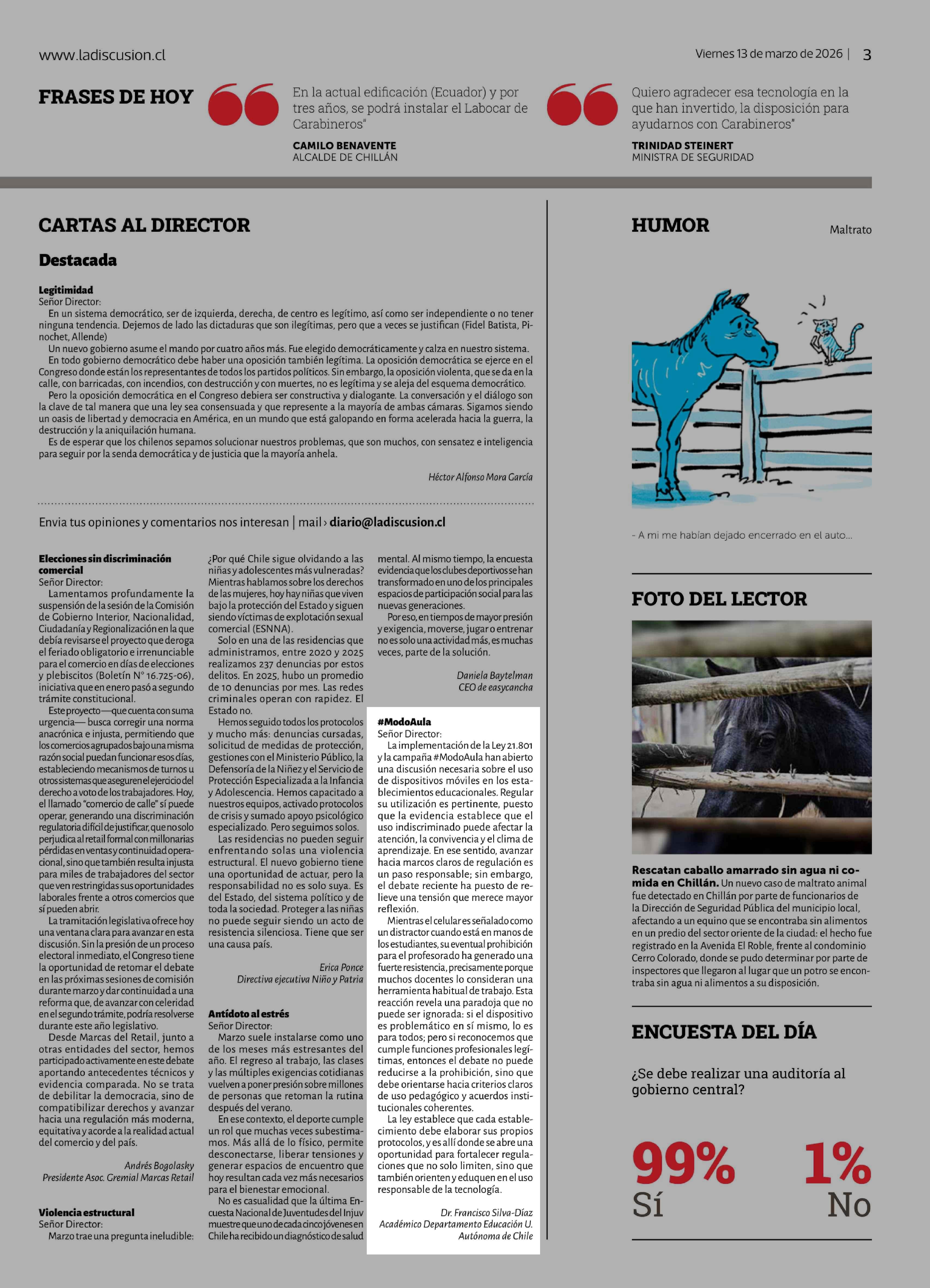 Título: Cartas: #ModoAula Señor Director: La implementación de la Ley 21.801 y la campaña # ModoAula han abierto una discusión necesaria sobre el uso de dispositivos móviles en los establecimientos educacionales. Regular su utilización es pertinente, puesto que la evidencia establece que el uso indiscrimina