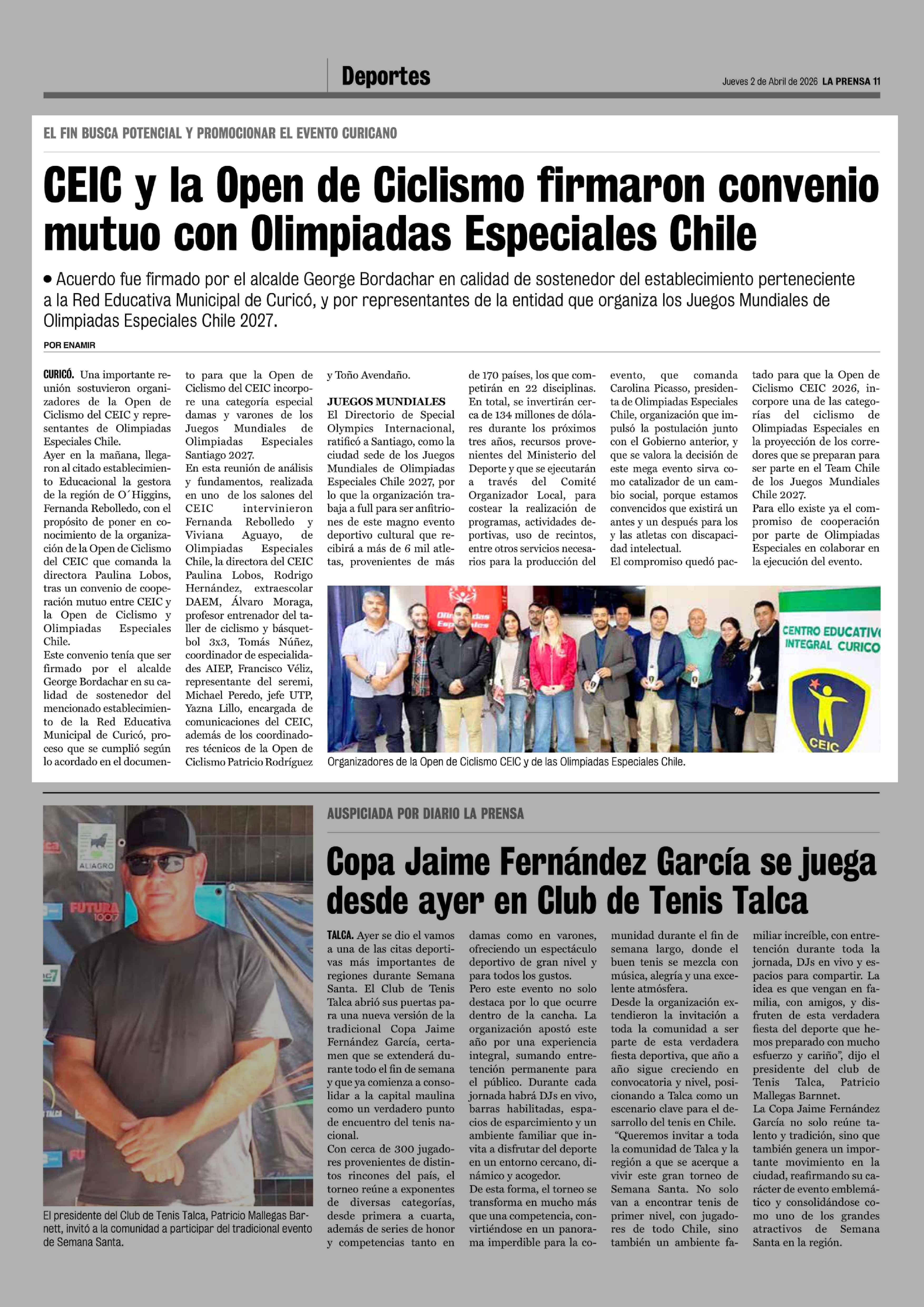 CEIC y la Open de Ciclismo firmaron convenio mutuo con Olimpiadas Especiales Chile 02-04-2026 La Prensa de Curicó |
