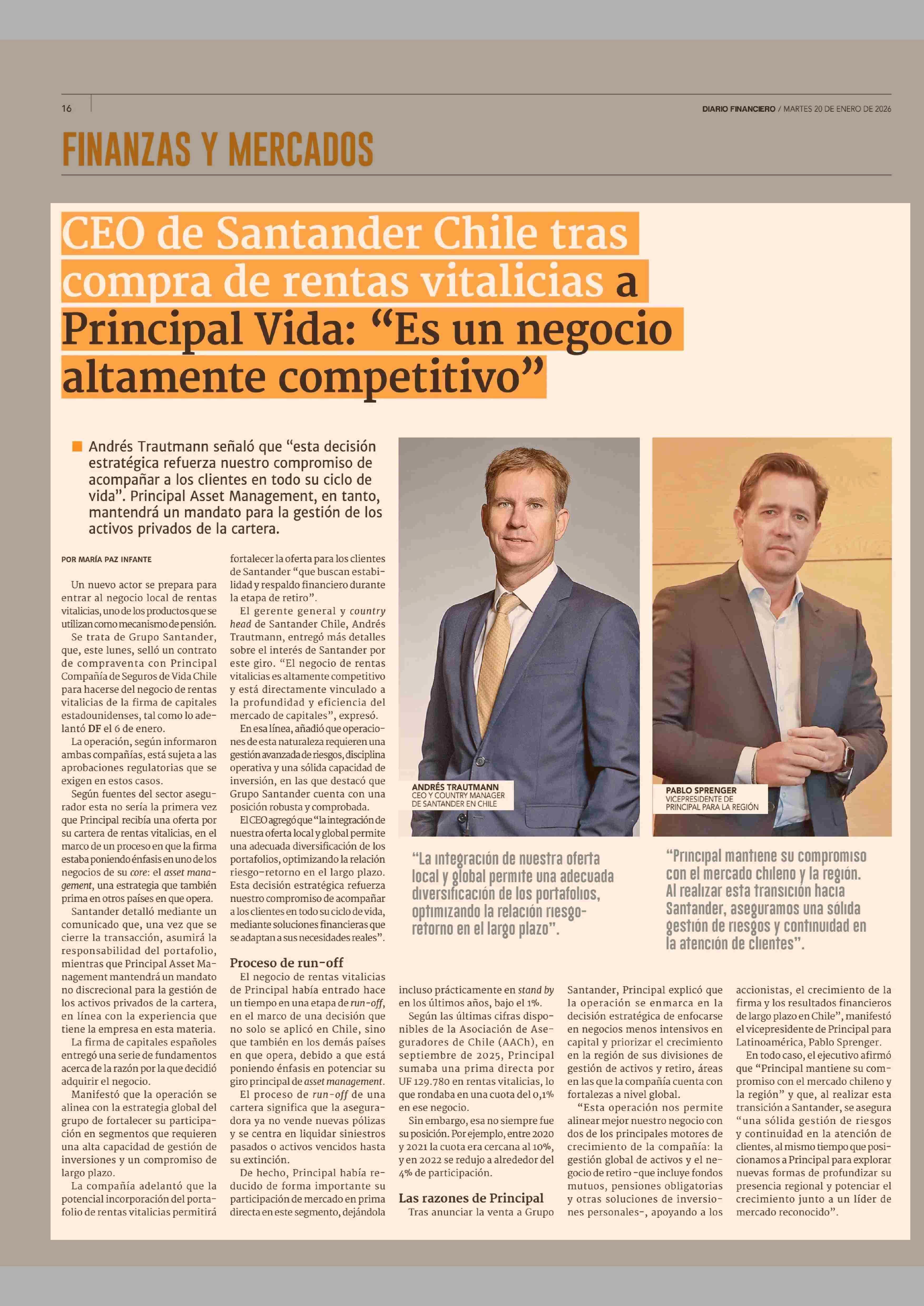CEO de Santander Chile tras compra de rentas vitalicias a Principal Vida: "Es un negocio altamente competitivo" 20-01-2026 Diario Financiero |