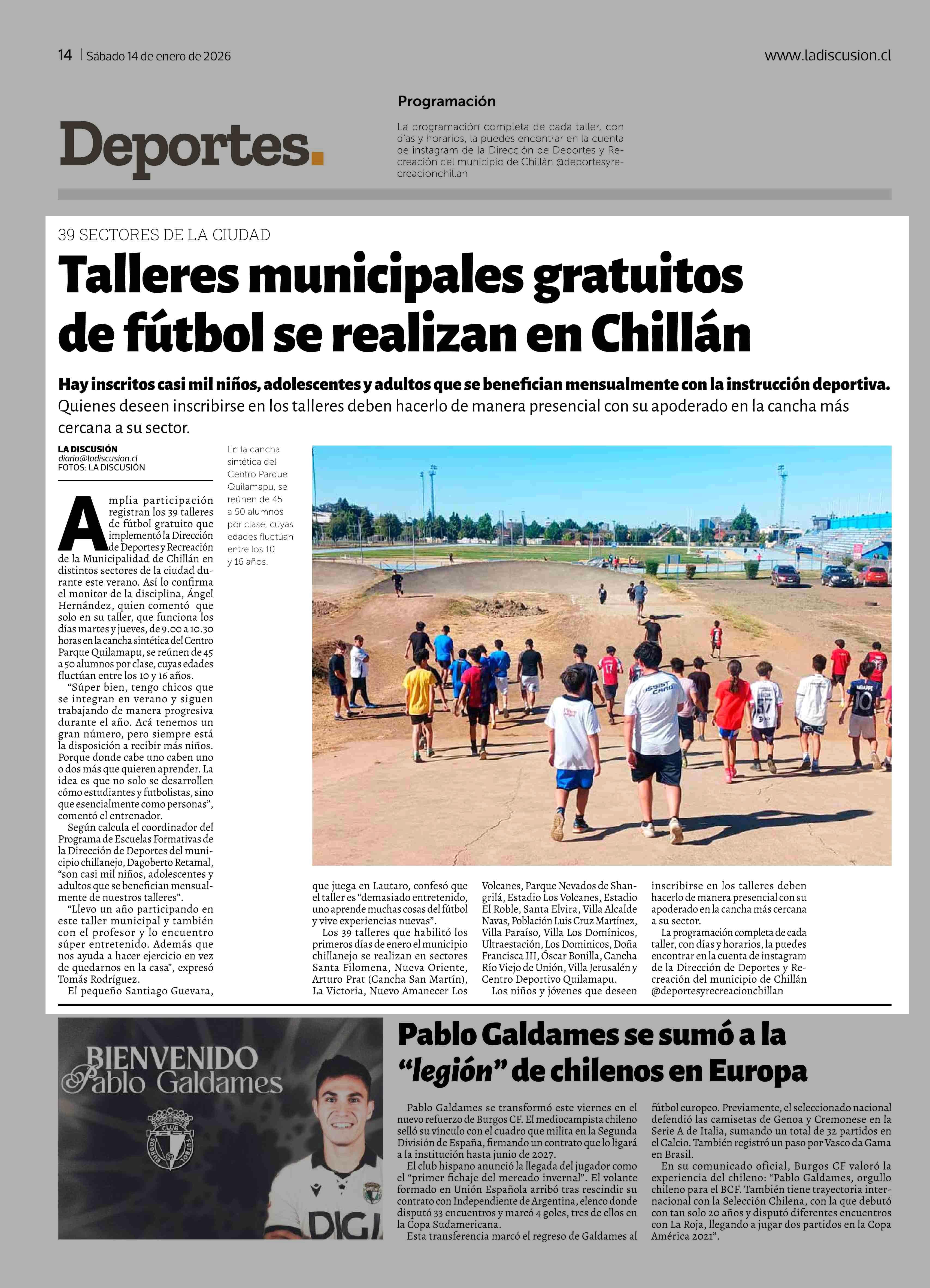 Talleres municipales gratuitos de fútbol se realizan en Chillán 24-01-2026 La Discusión |