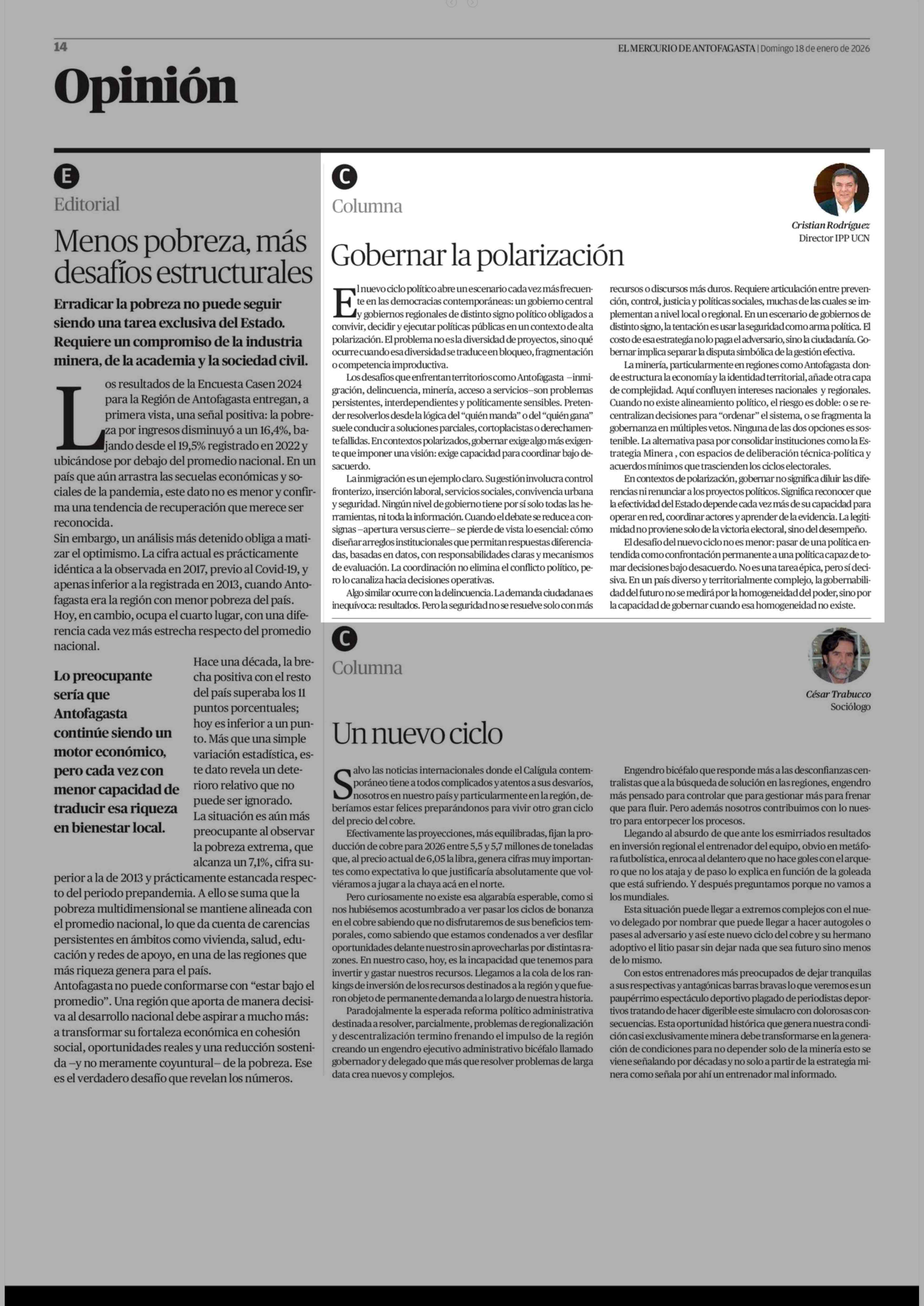 Columnas de Opinión: Gobernar la polarización 18-01-2026 El Mercurio de Antofagasta |