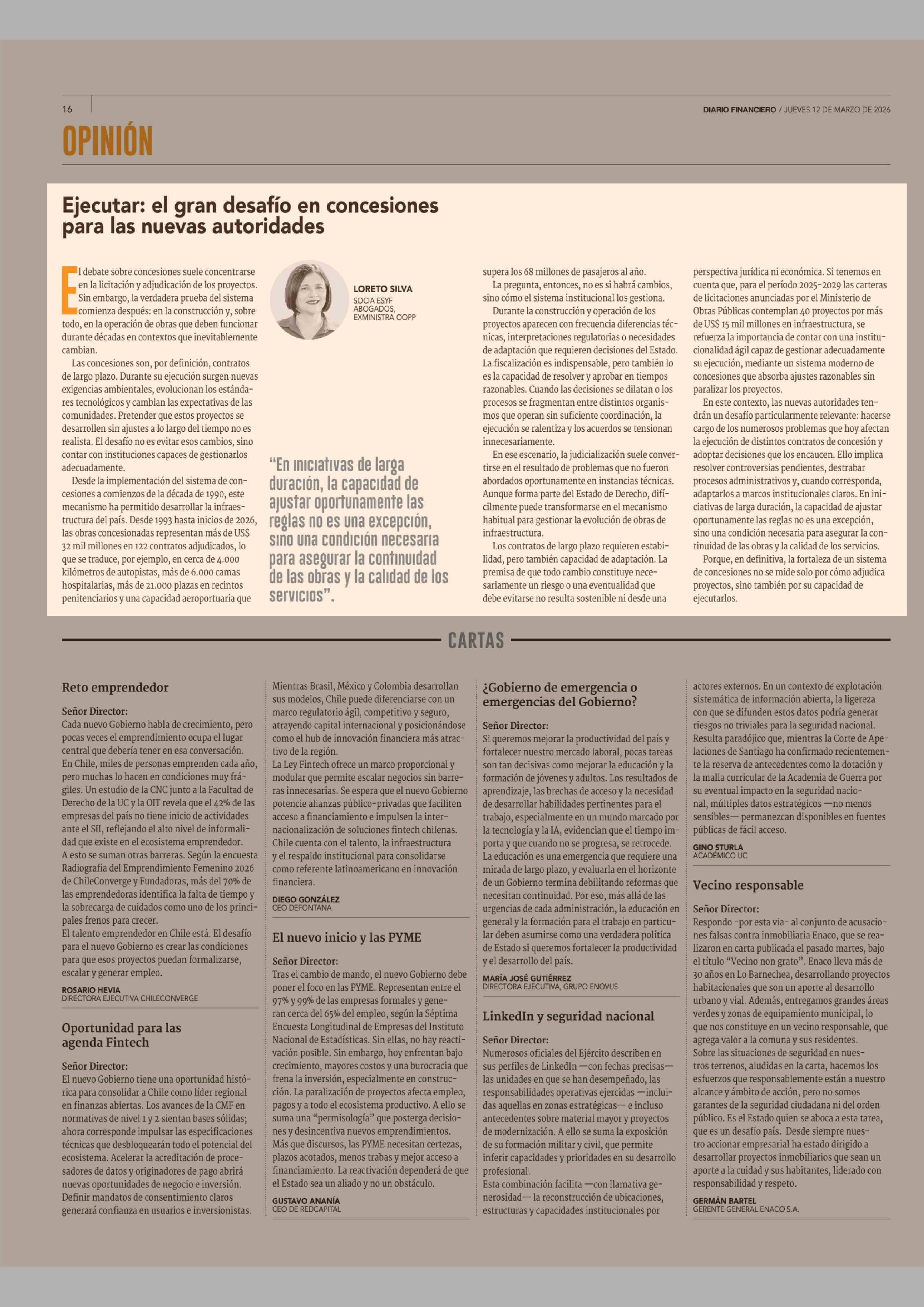 Columnas de Opinión: Ejecutar: el gran desafío en concesiones para las nuevas autoridades 12-03-2026 Diario Financiero |
