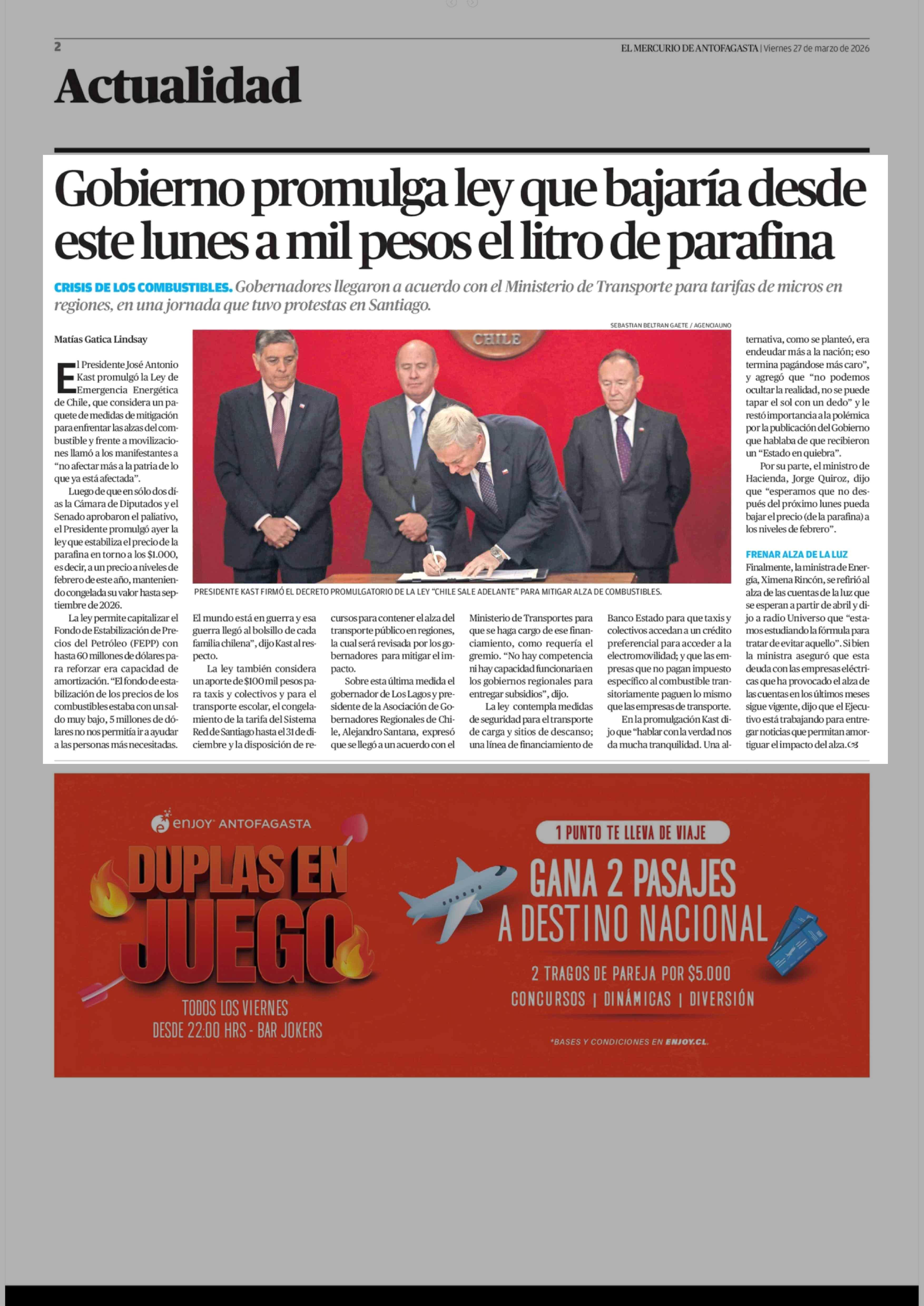 Gobierno promulga ley que bajaría desde este lunes a mil pesos el litro de parafina 27-03-2026 El Mercurio de Antofagasta |
