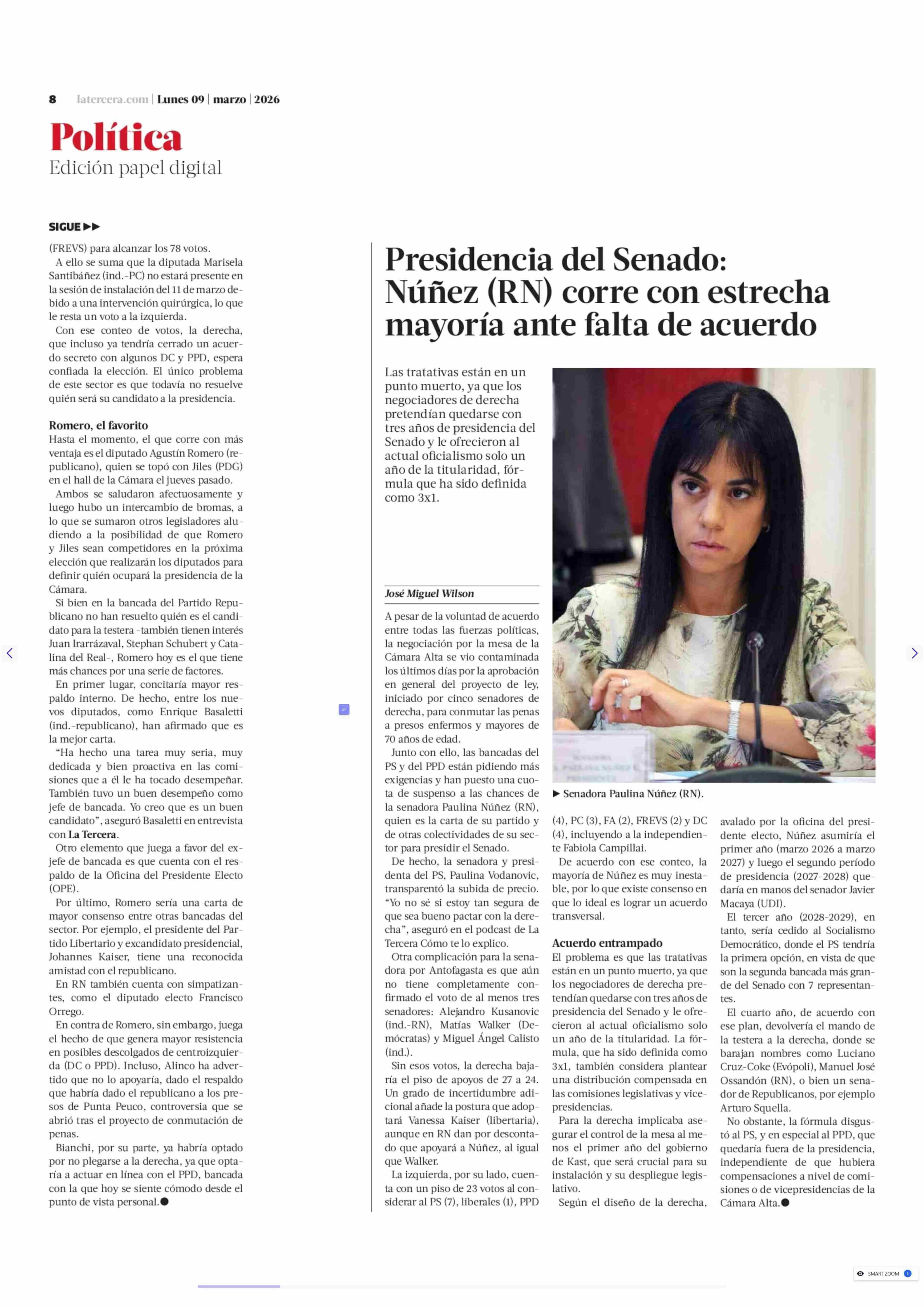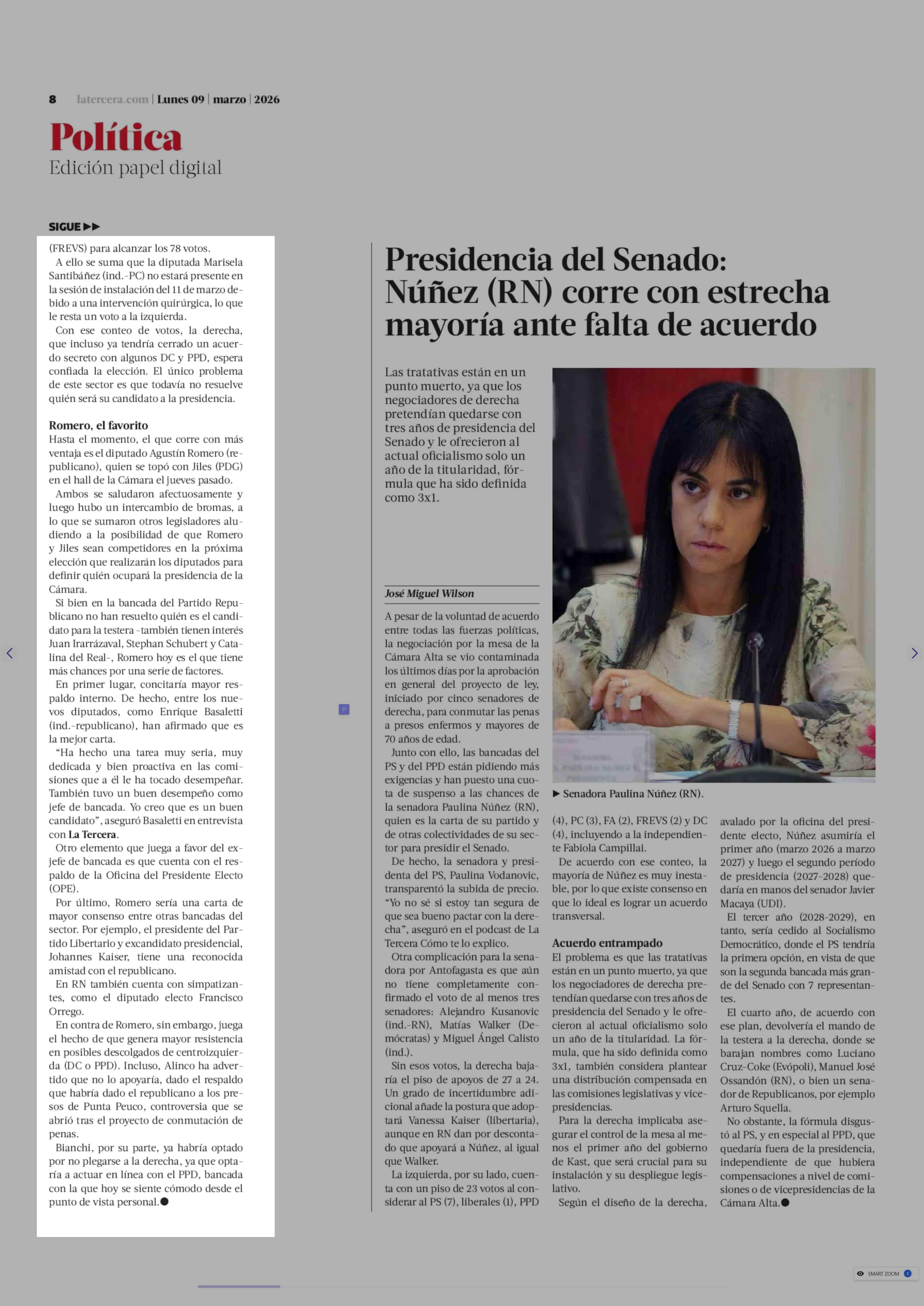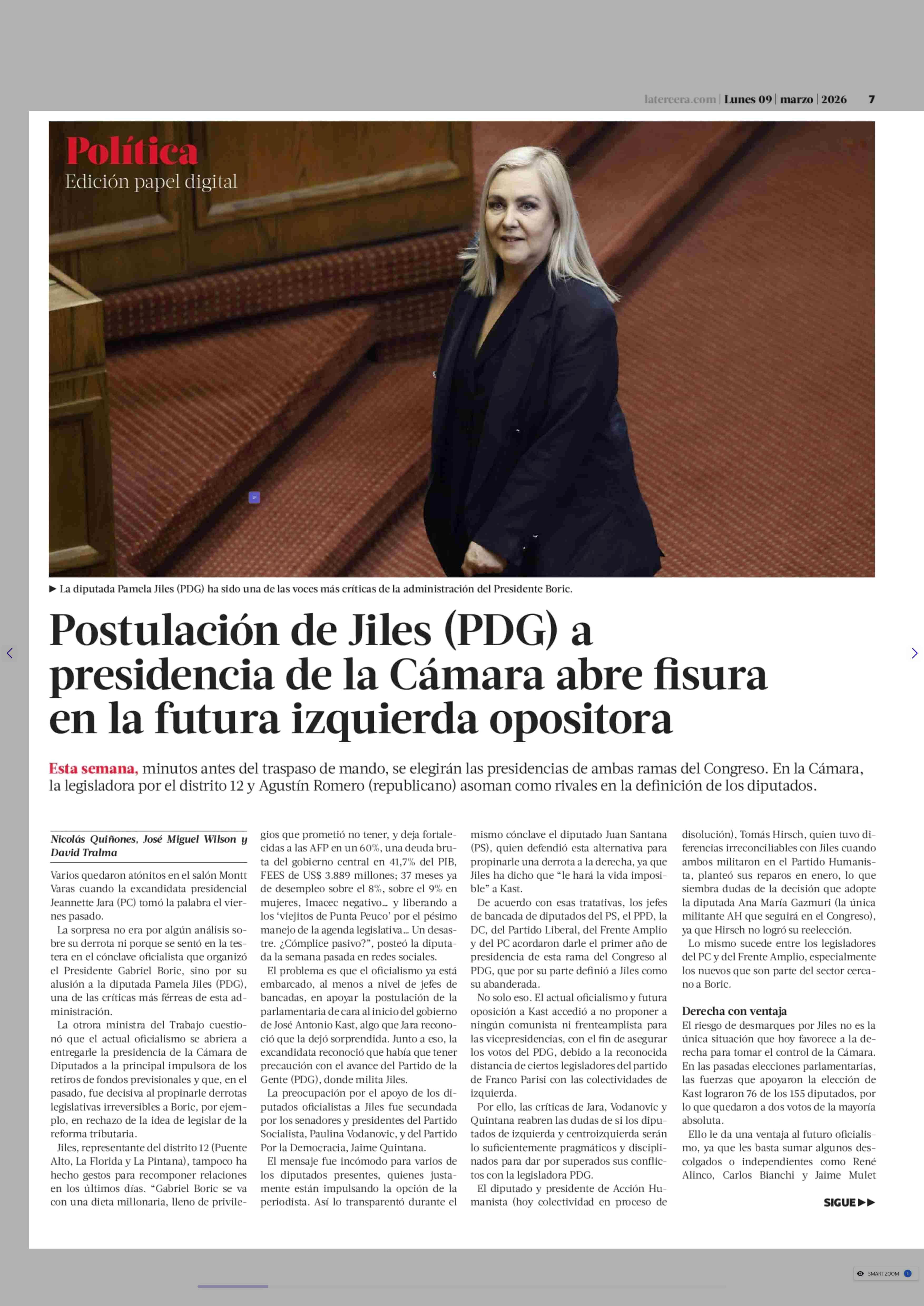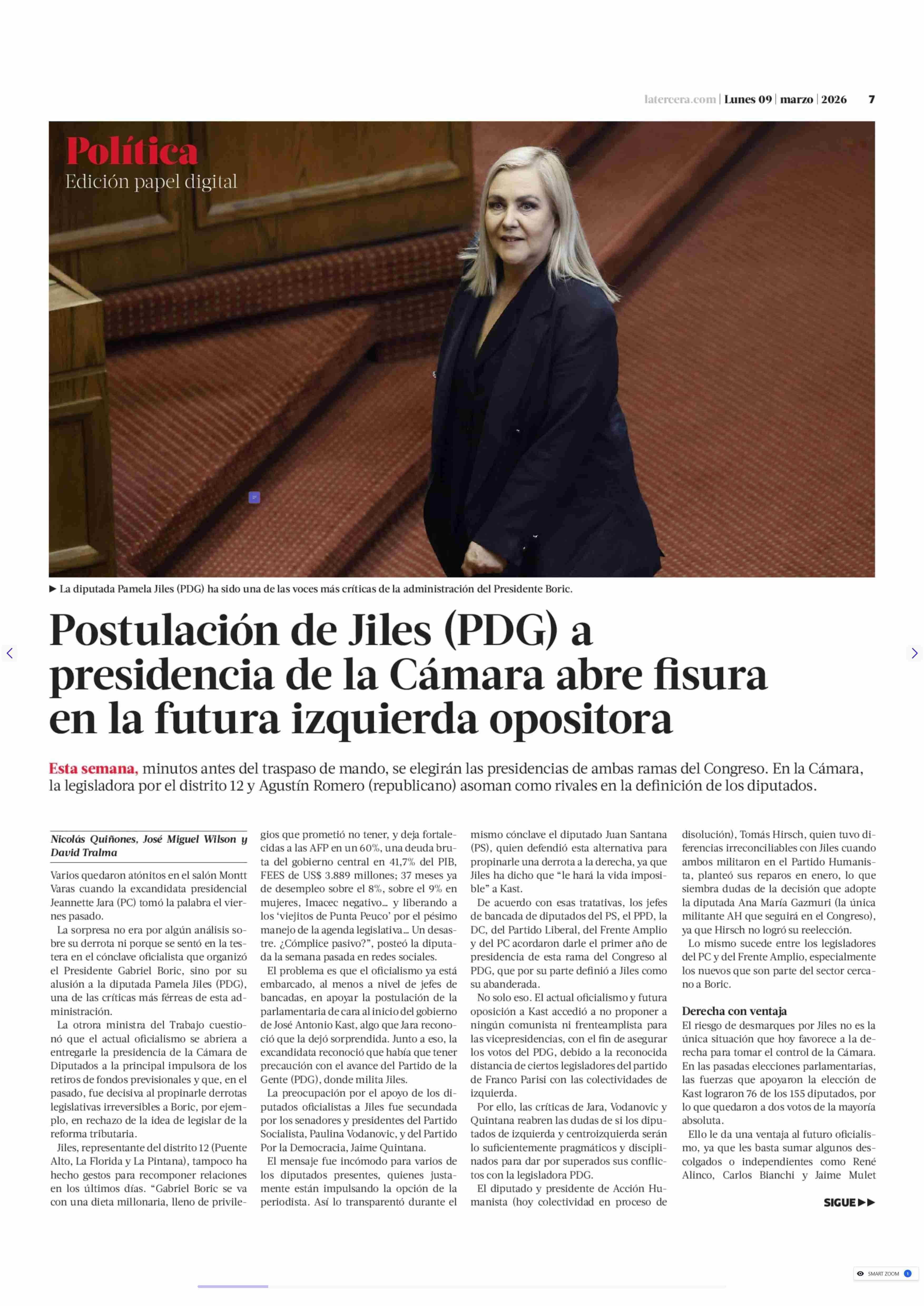 Postulación de Jiles (PDG) a presidencia de la Cámara abre fisura en la futura izquierda opositora 09-03-2026 La Tercera |