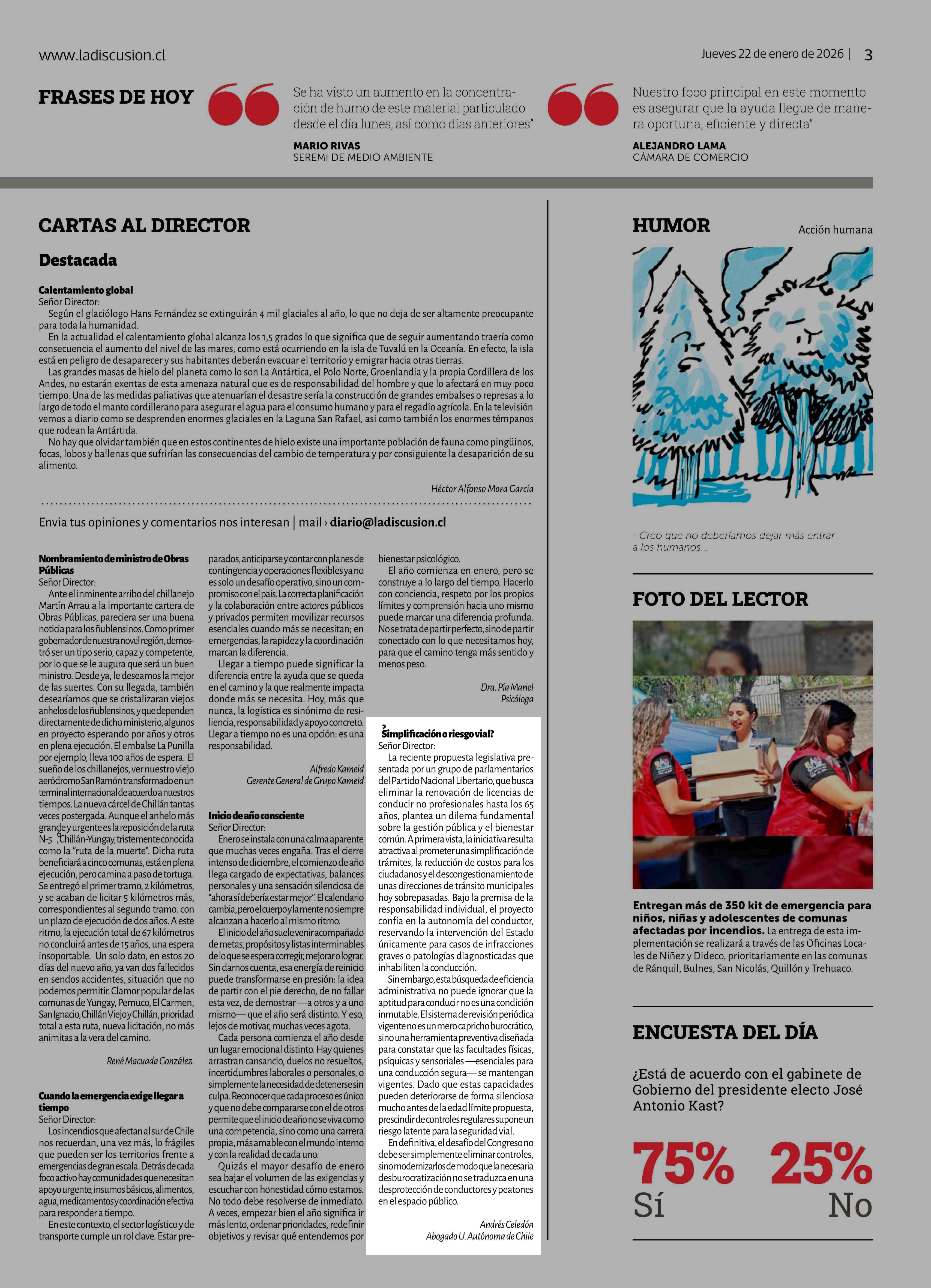 Título: Cartas: ¿Simplificación o riesgo vial? Señor Director: La reciente propuesta legislativa presentada por un grupo de parlamentarios del Partido Nacional Libertario, que busca eliminar la renovación de licencias de conducir no profesionales hasta los 65 años, plantea un dilema fundamental sobre la ges