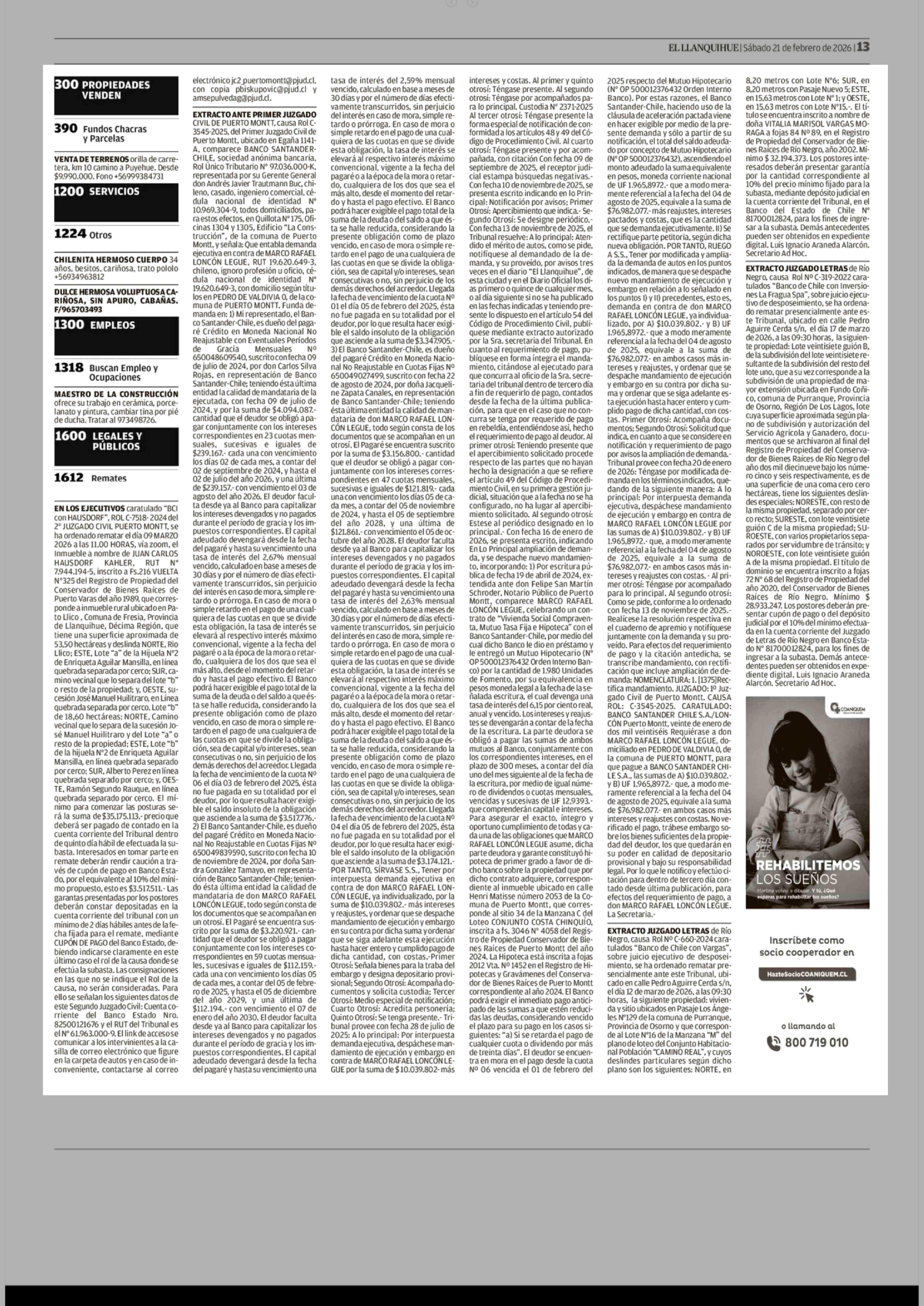 Remates: 1200 SERVICIOS 21-02-2026 El Llanquihue |