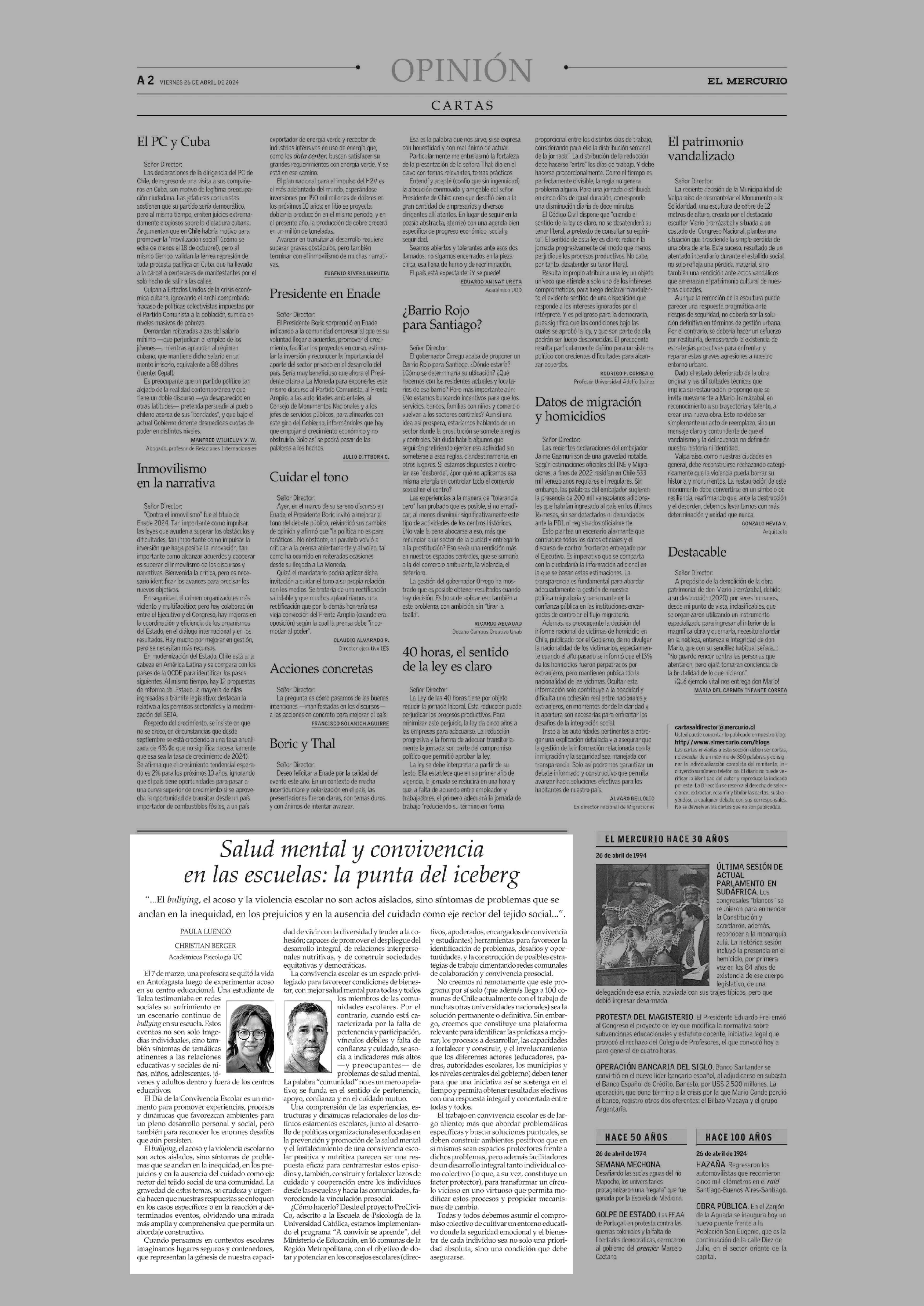 Salud mental y convivencia en las escuelas: la punta del iceberg 26-04-2024 El Mercurio |