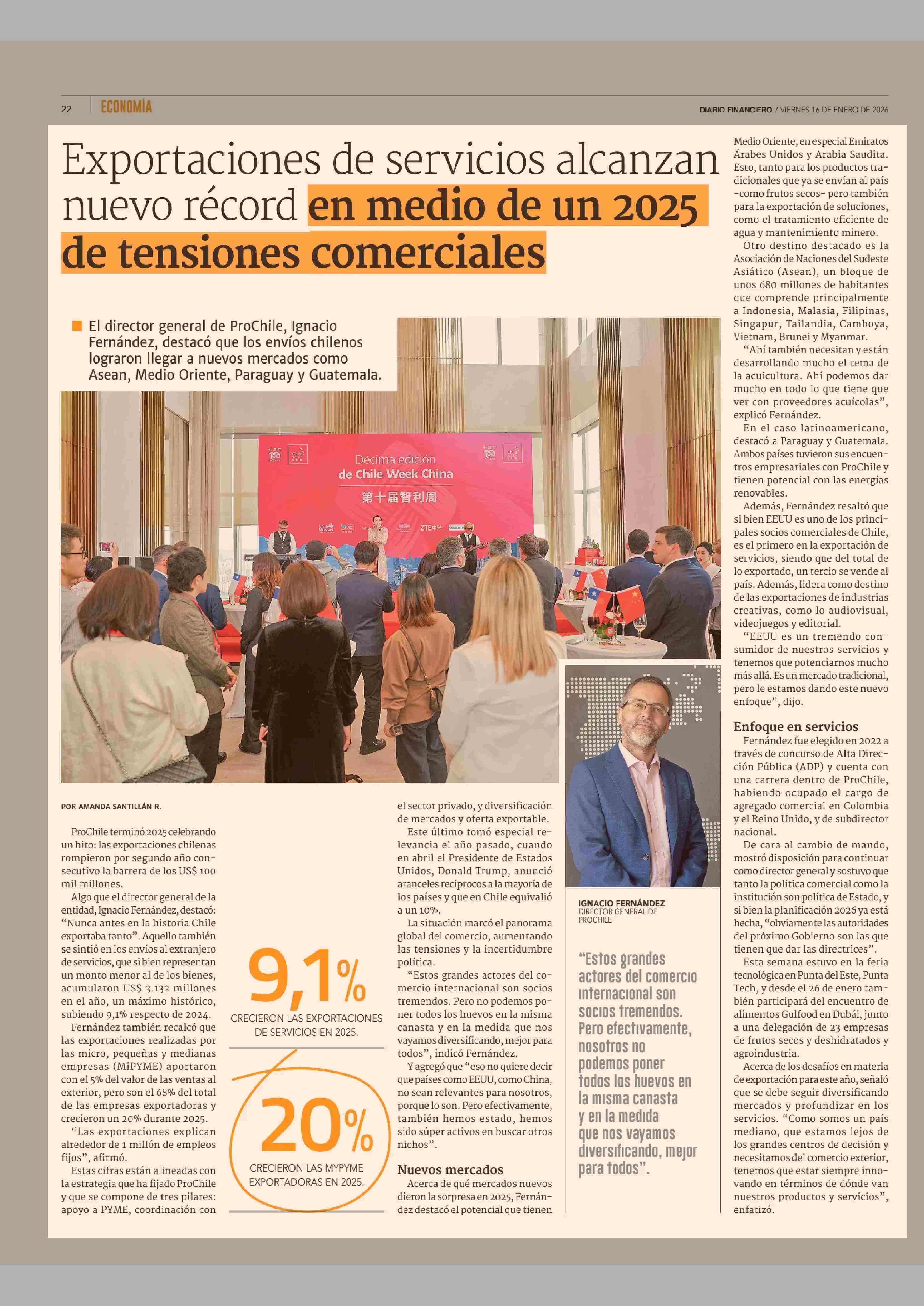 Exportaciones de servicios alcanzan nuevo récord en medio de un 2025 de tensiones comerciales 16-01-2026 Diario Financiero |