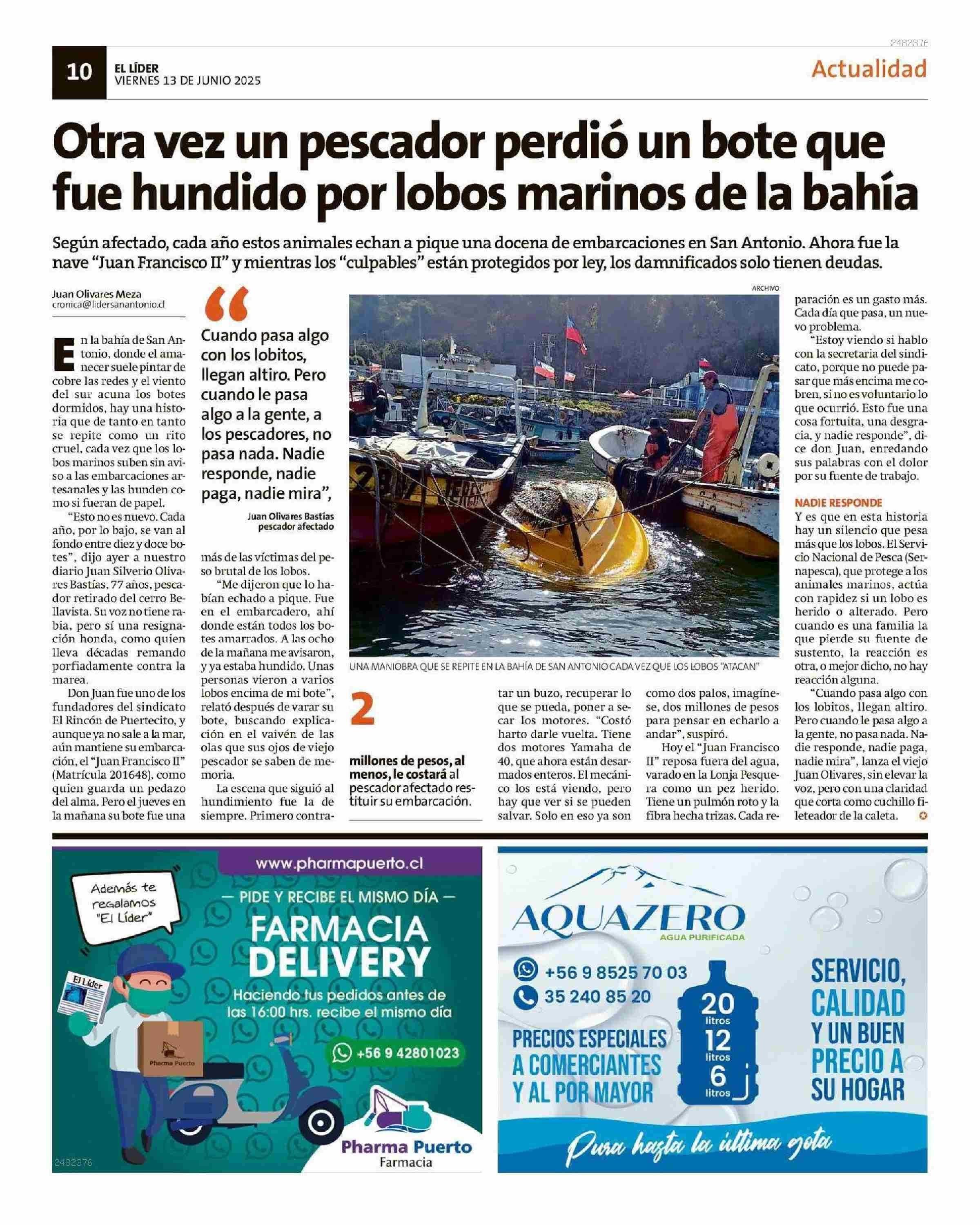 Otra vez un pescador perdió un bote que fue hundido por lobos marinos de la bahía 13-06-2025 El Líder |
