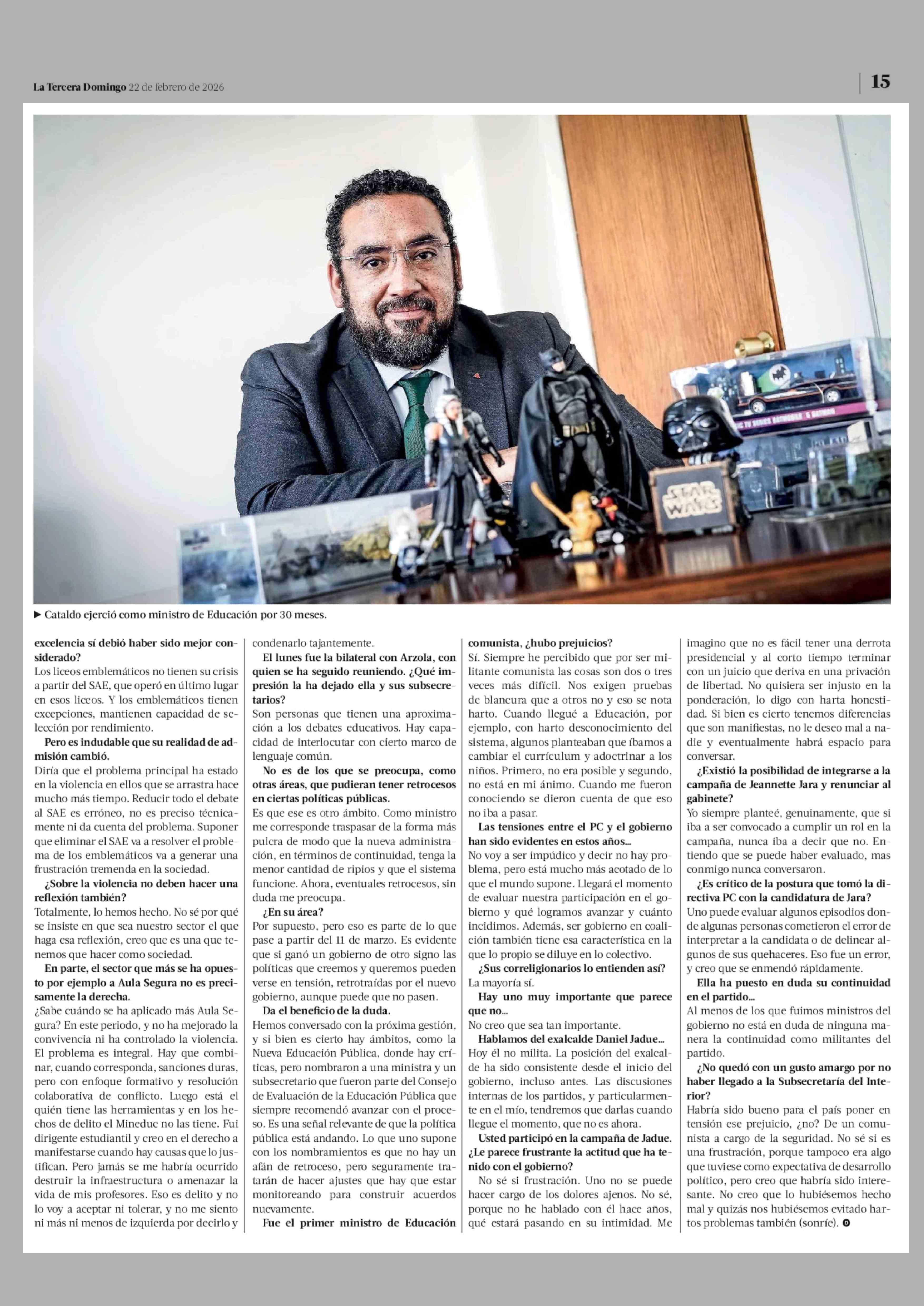 Nicolás Cataldo: "Por el rol que me ha tocado ejercer entiendo hoy que uno no está para simbolismos y tiene que ser pragmático" 22-02-2026 La Tercera |