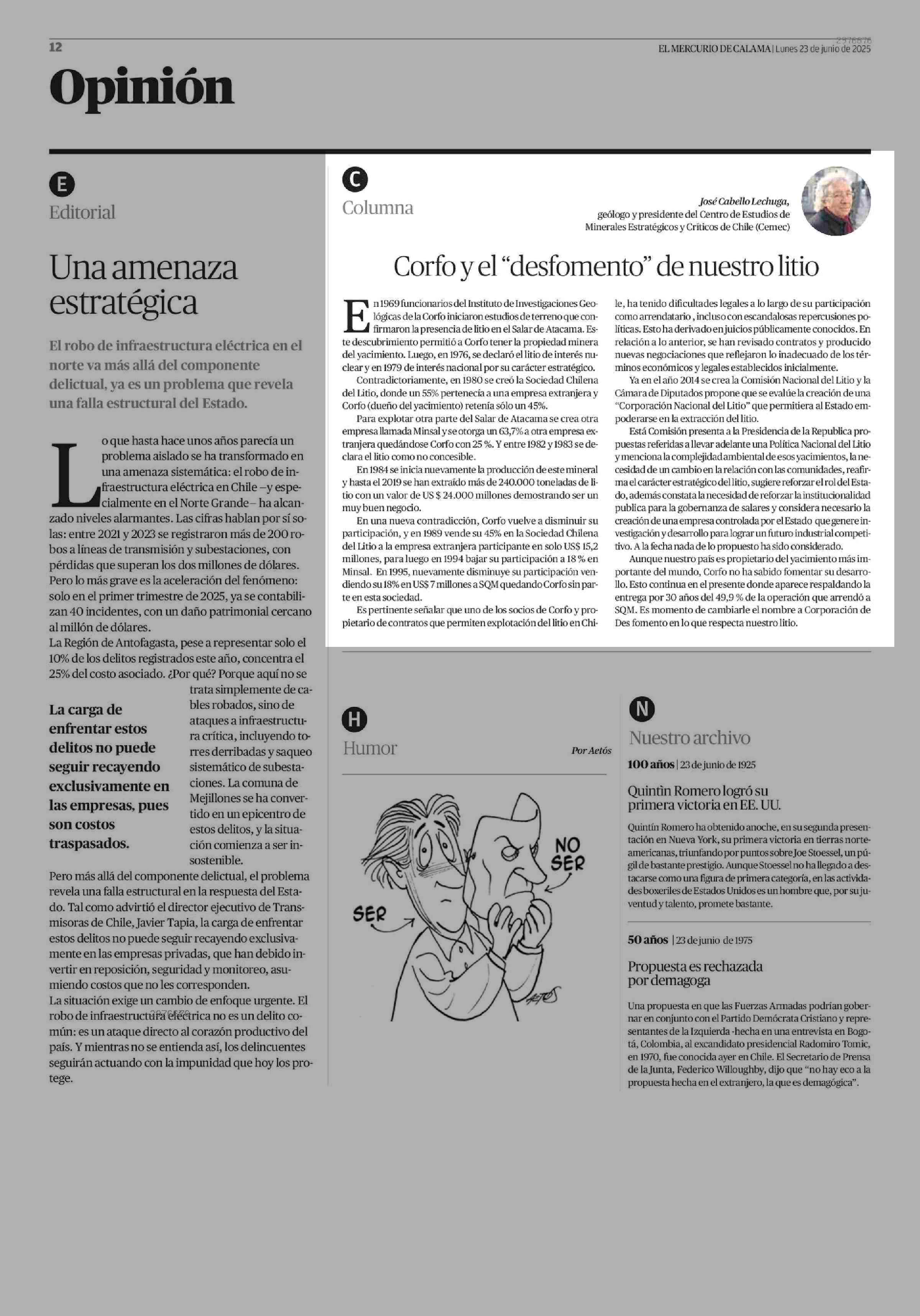 Corfo y el “desfomento” de nuestro litio 23-06-2025 El Mercurio de Calama |
