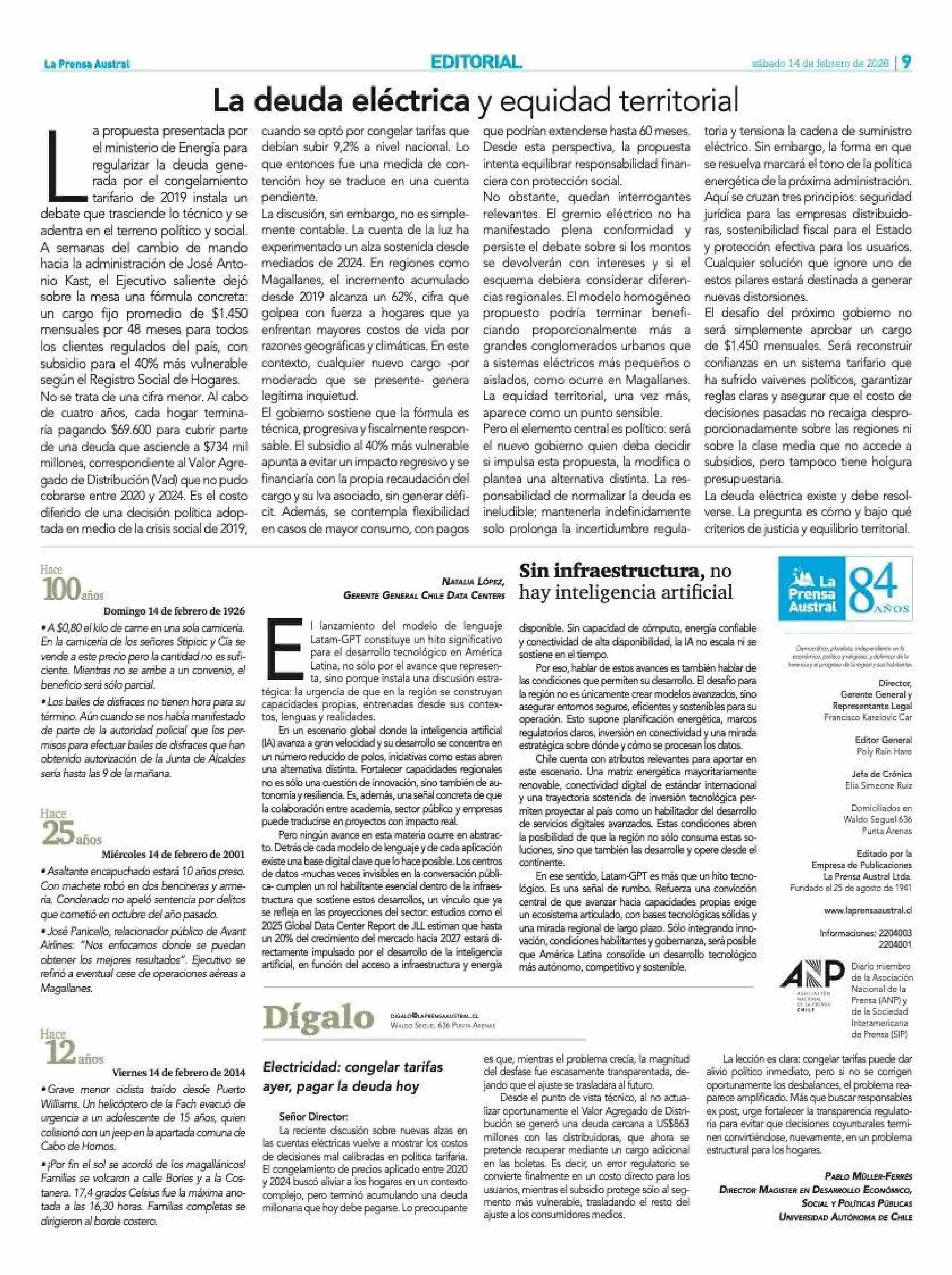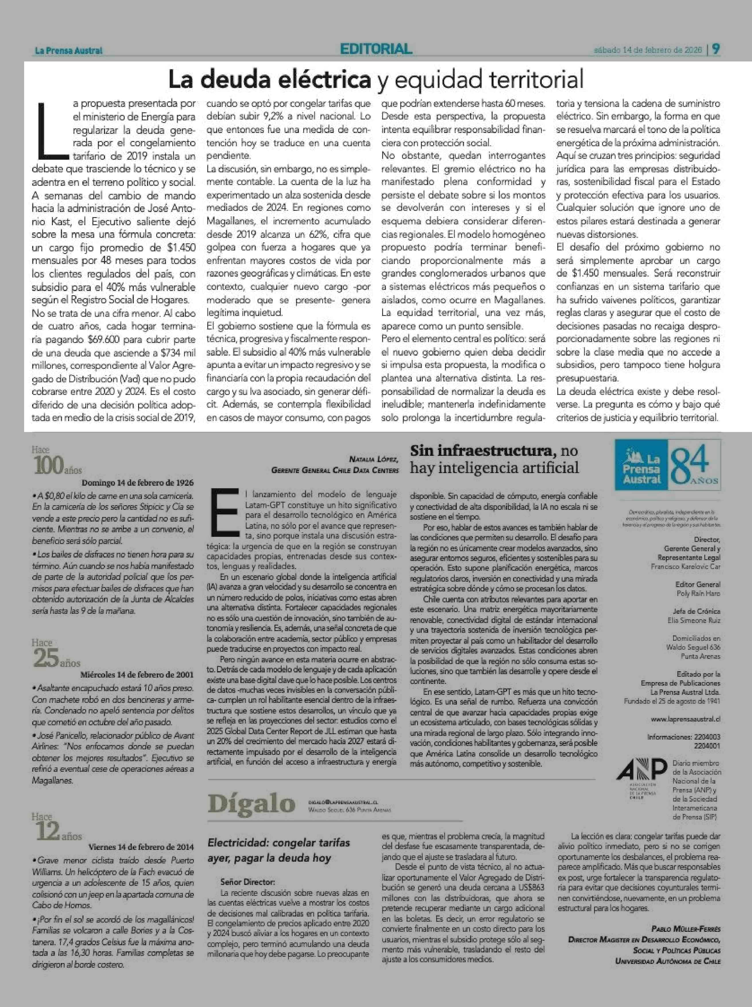 EDITORIAL: La deuda eléctrica y equidad territorial 14-02-2026 La Prensa Austral |