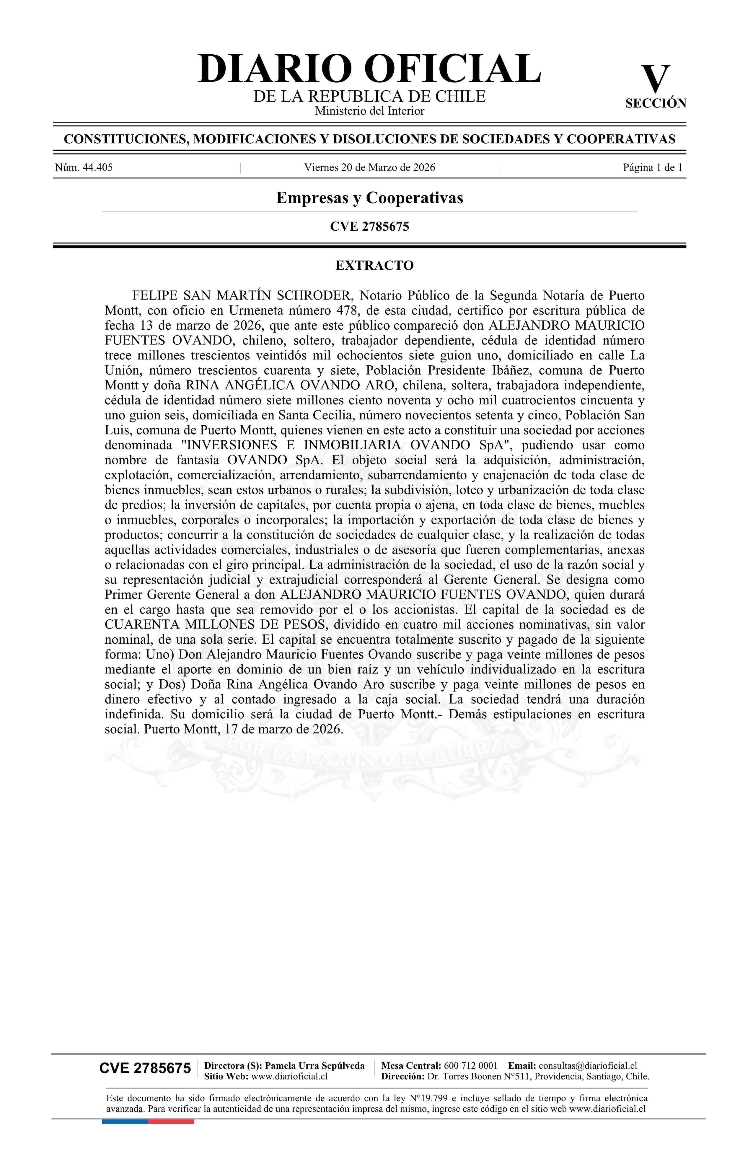 INVERSIONES E INMOBILIARIA OVANDO SpA 20-03-2026 Diario Oficial Edición Electrónica |