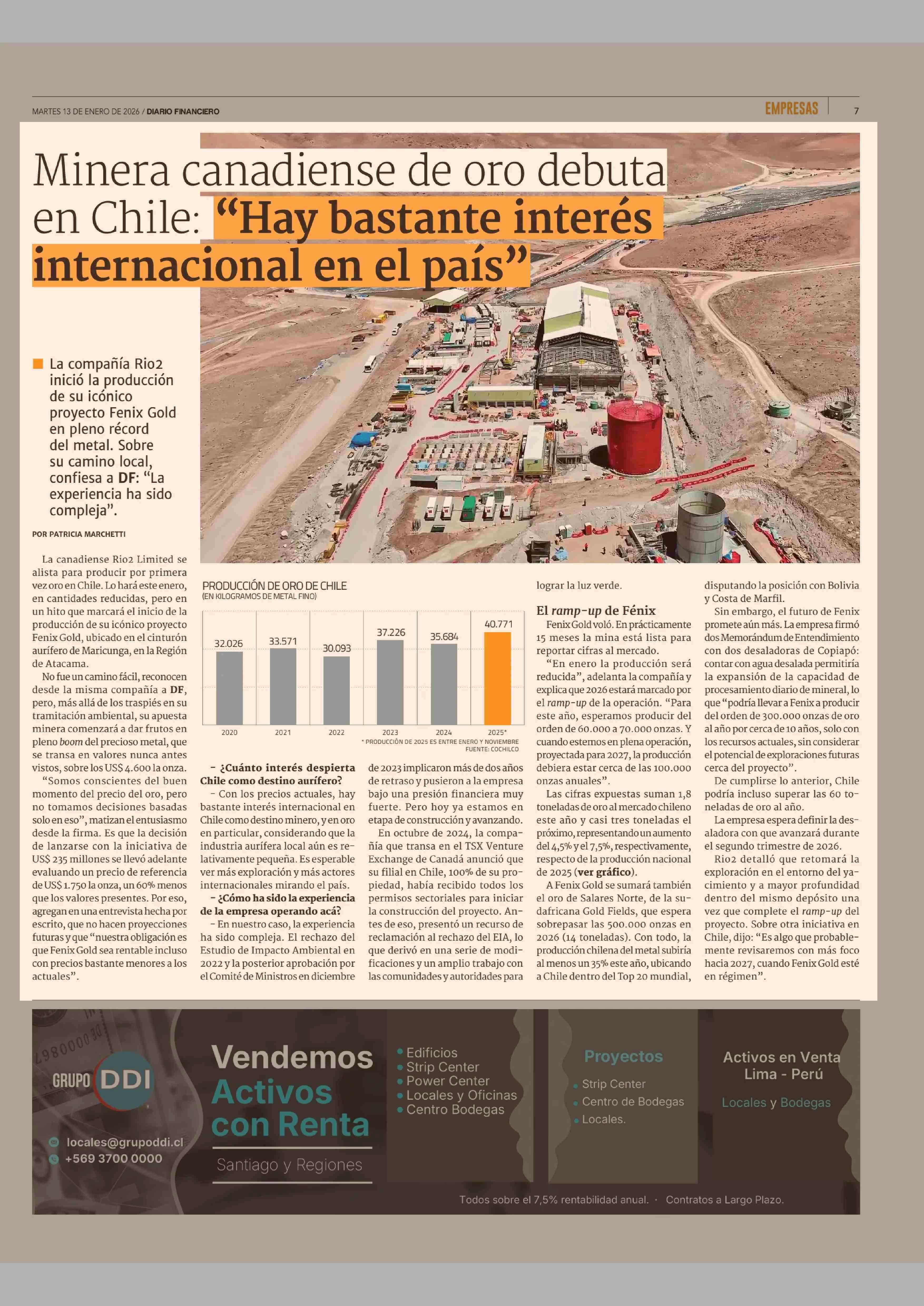 Minera canadiense de oro debuta en Chile: "Hay bastante interés internacional en el país" 13-01-2026 Diario Financiero |
