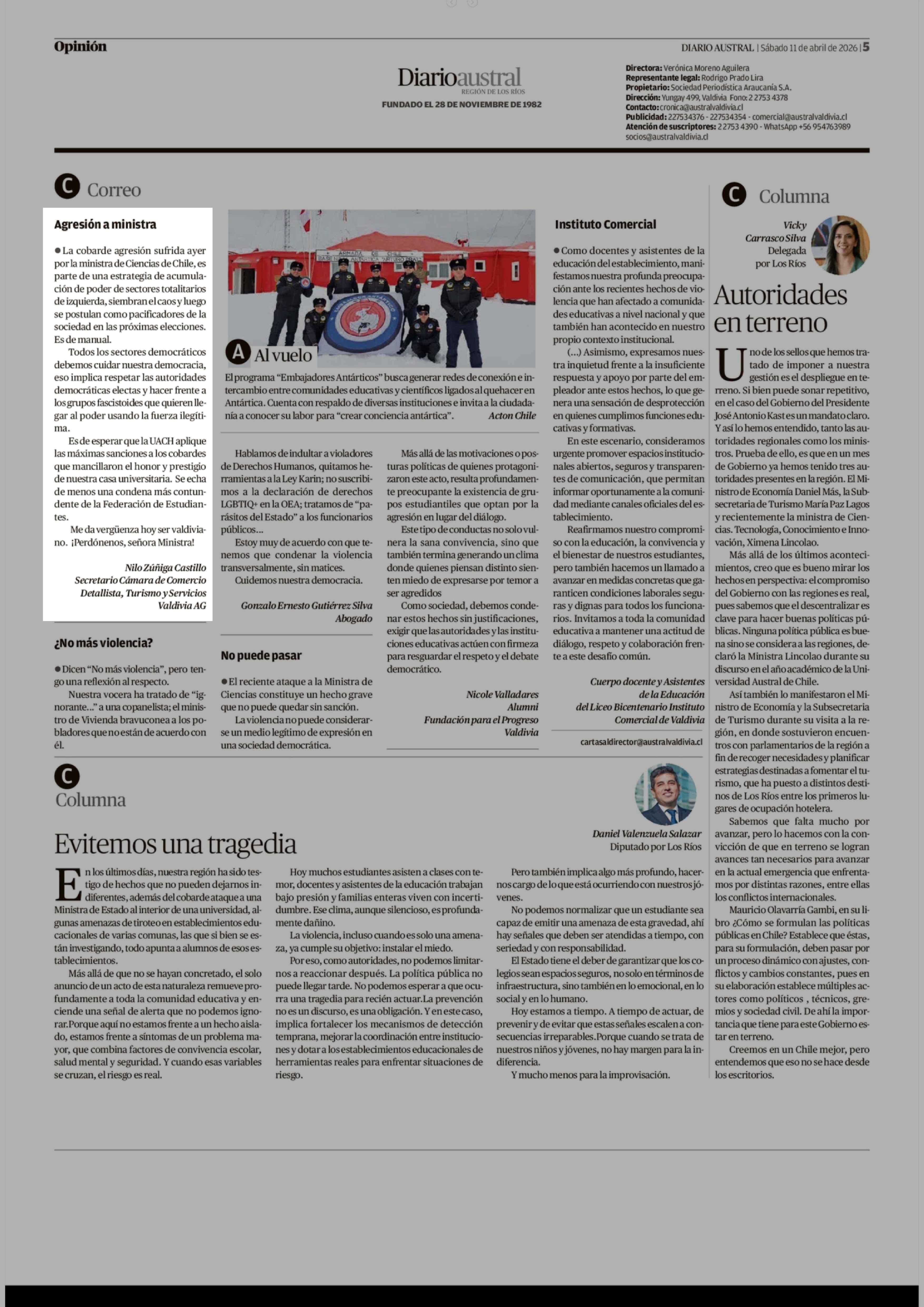 Cartas: Agresión a ministra 11-04-2026 Diario Austral Región de Los Ríos |