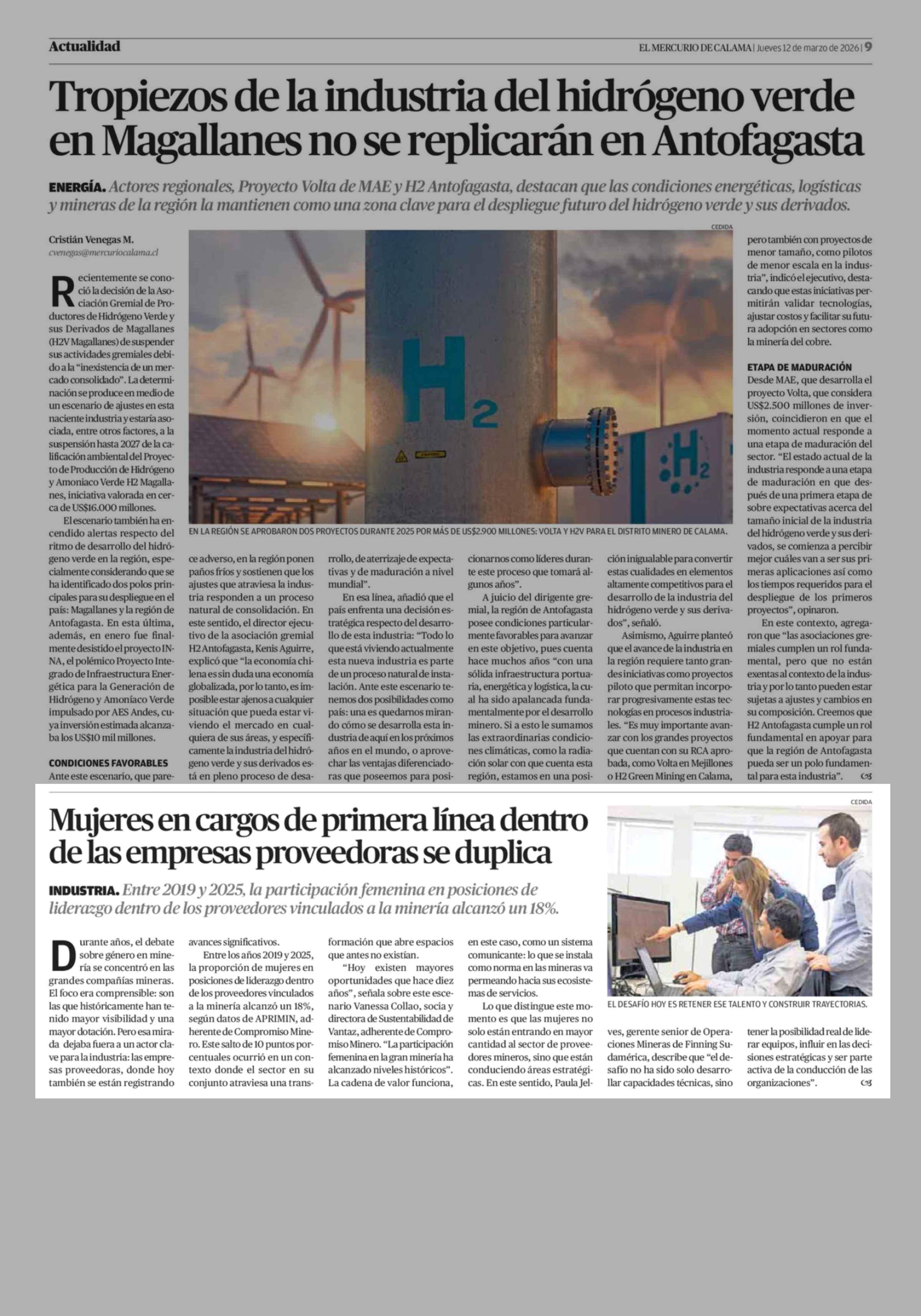 Mujeres en cargos de primera línea dentro de las empresas proveedoras se duplica 12-03-2026 El Mercurio de Calama |