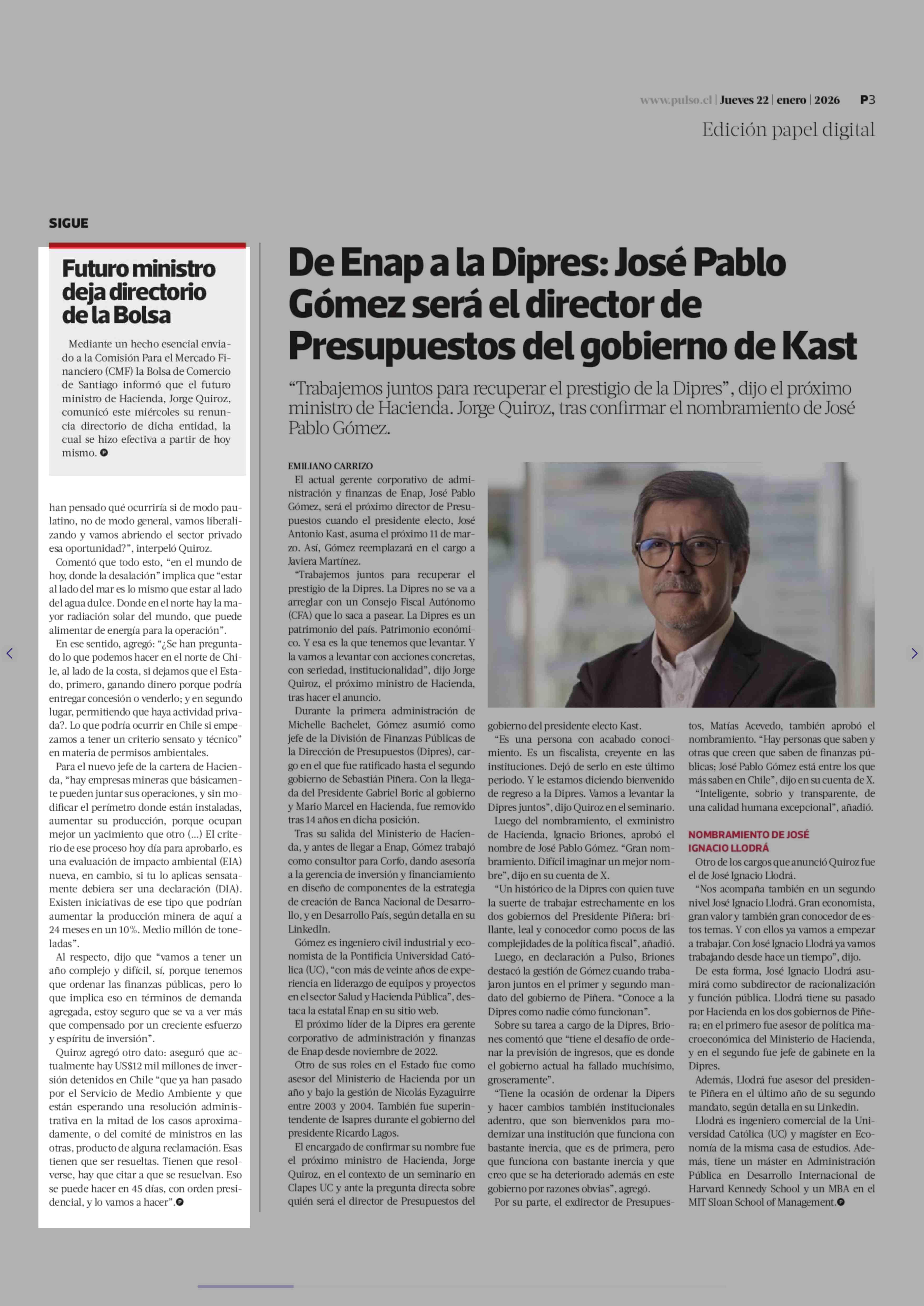Las primeras definiciones de Quiroz: batería de medidas para marzo y envío de reforma tributaria en abril 22-01-2026 La Tercera |