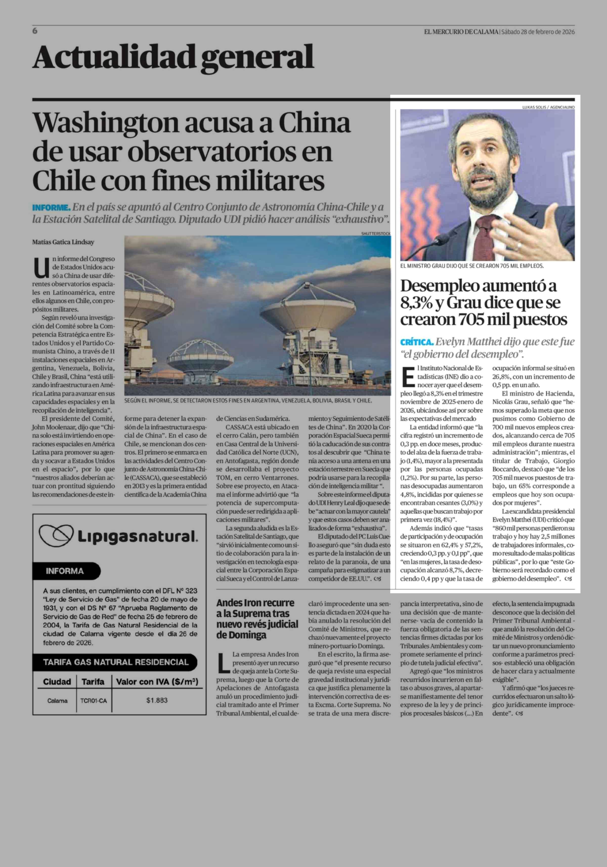 Desempleo aumentó a 8,3% y Grau dice que se crearon 705 mil puestos 28-02-2026 El Mercurio de Calama |